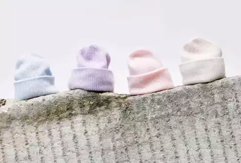 Styling-Tipps: Kopfbedeckungen in ähnlichen Sorbet-Tönen verleihen deinem Look zusätzliche Raffinesse. Um den Pastell-Look zu brechen, kombiniere einfach schwarze Stiefel dazu.