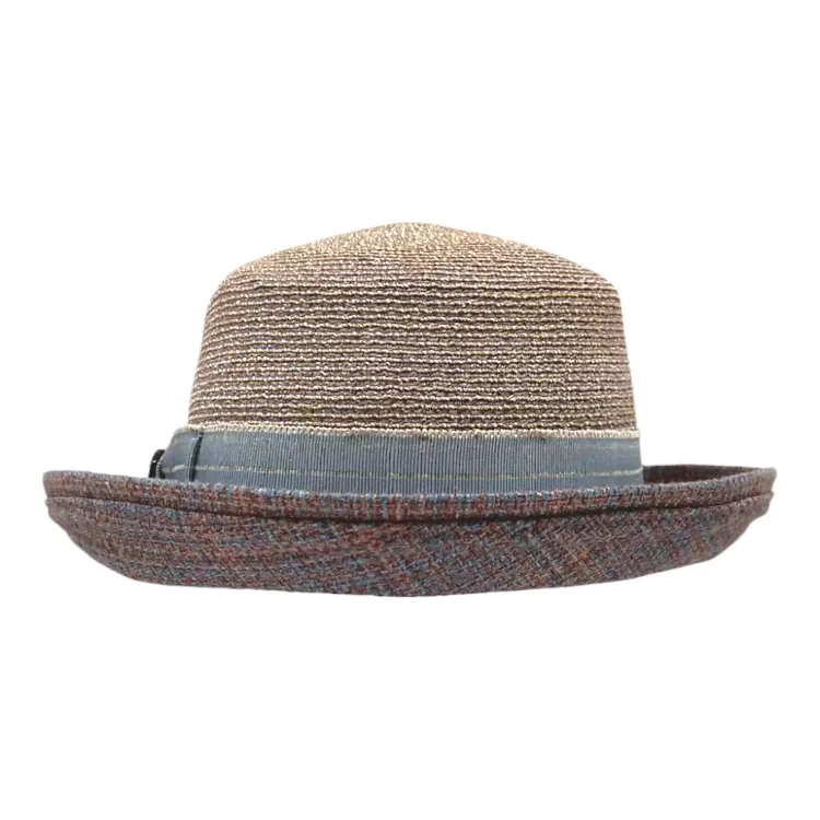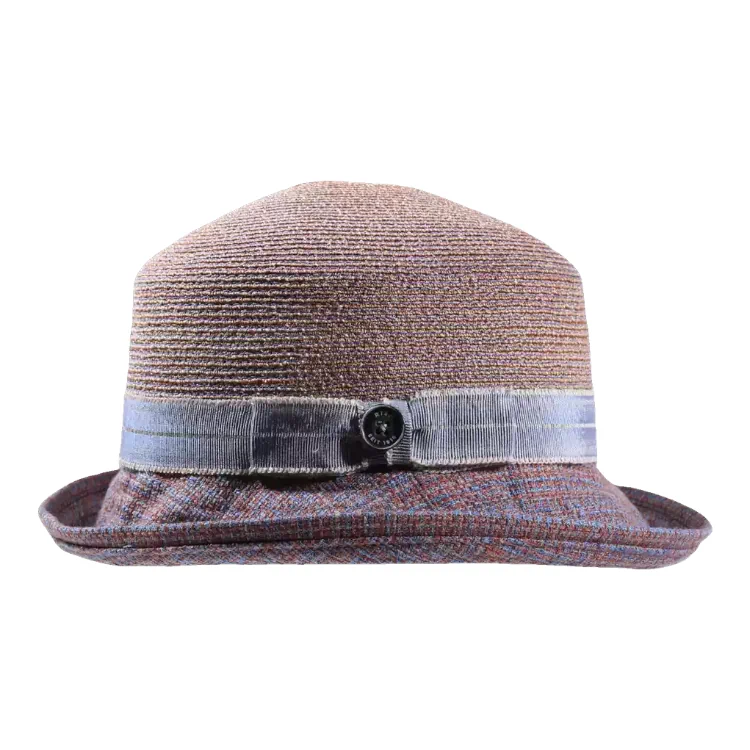 Die Kombination aus natürlichen Fasern und strukturreichem Farbspiel macht diesen Hut zu einem echten Blickfang. Die formschöne Krempe ist dezent nach oben aufgeschlagen, was dem Design Leichtigkeit und Raffinesse verleiht. Das hochwertige Leinenband und der Knopf runden das Design stilsicher ab.