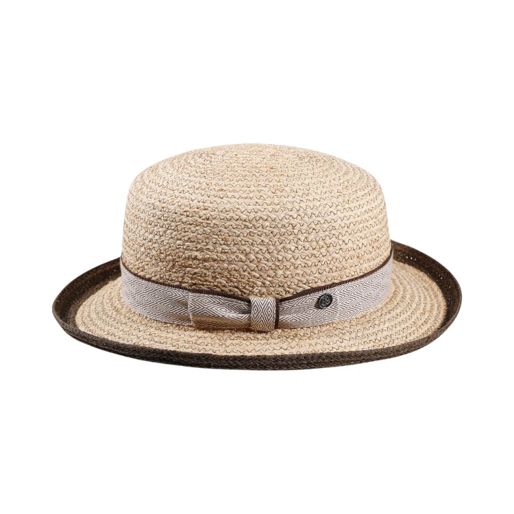 Die sichtbare, spiralig vernähte Raffia-Struktur unterstreicht die handwerkliche Präzision. Besonders stilprägend ist das hochwertige Baumwollband mit feinem Rauten-Dessin (Romboid), veredelt mit einer eleganten Paspel und einer klassischen Masche. Der ikonische Qualitätsknopf mit der Aufschrift «Risa seit 1919» setzt ein dezentes, aber bedeutungsvolles Statement für Schweizer Handwerkskunst.