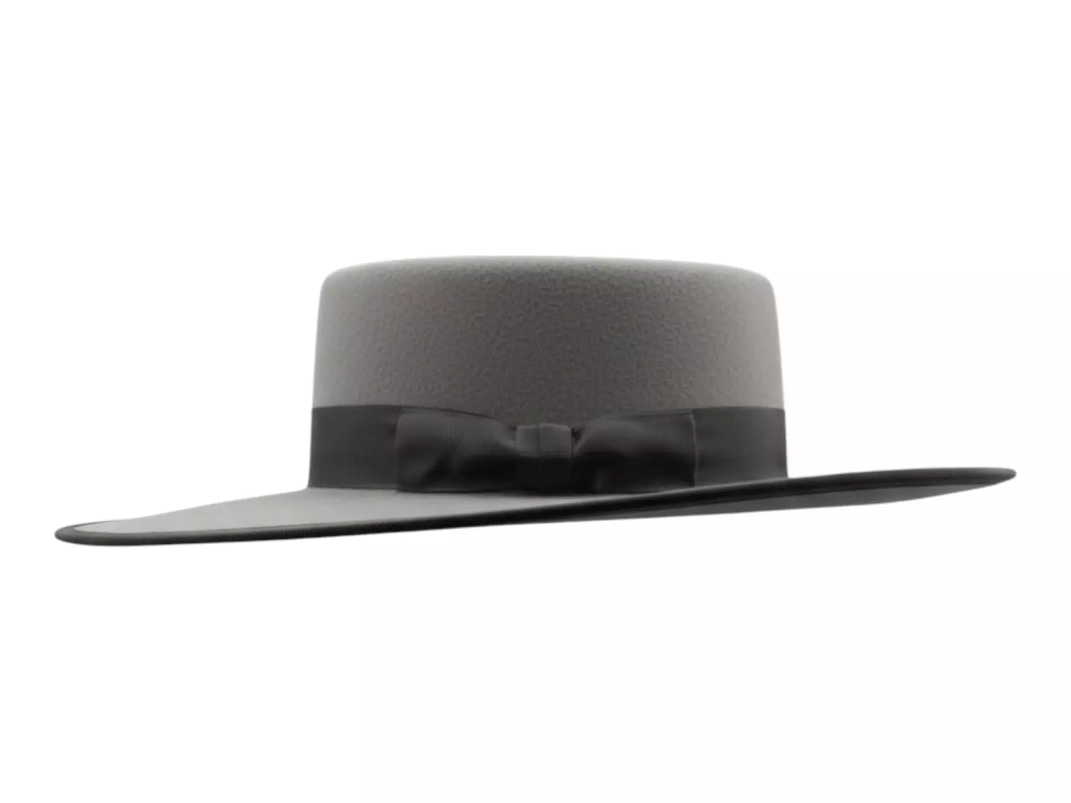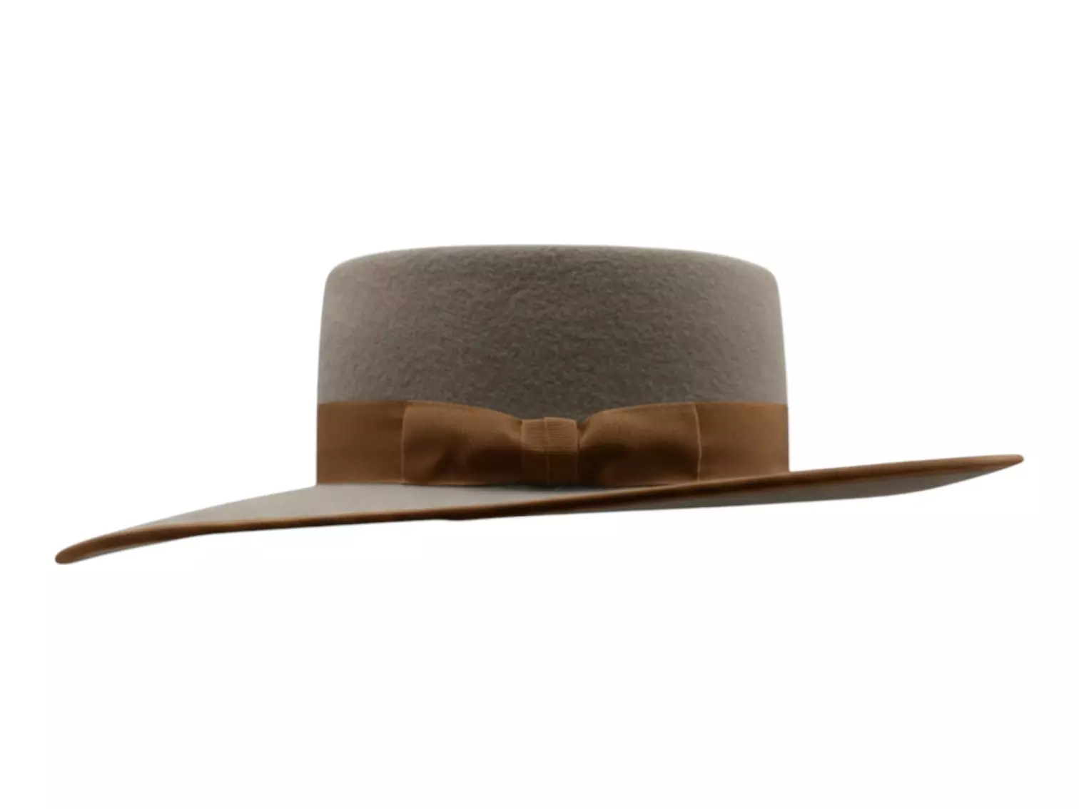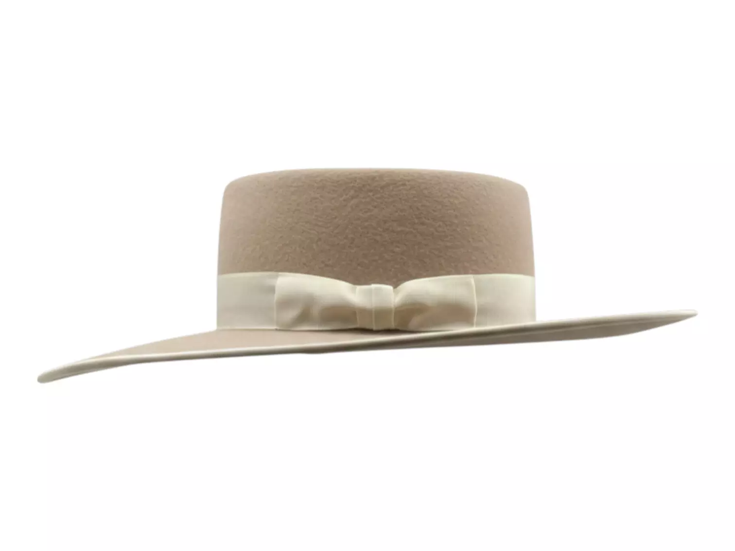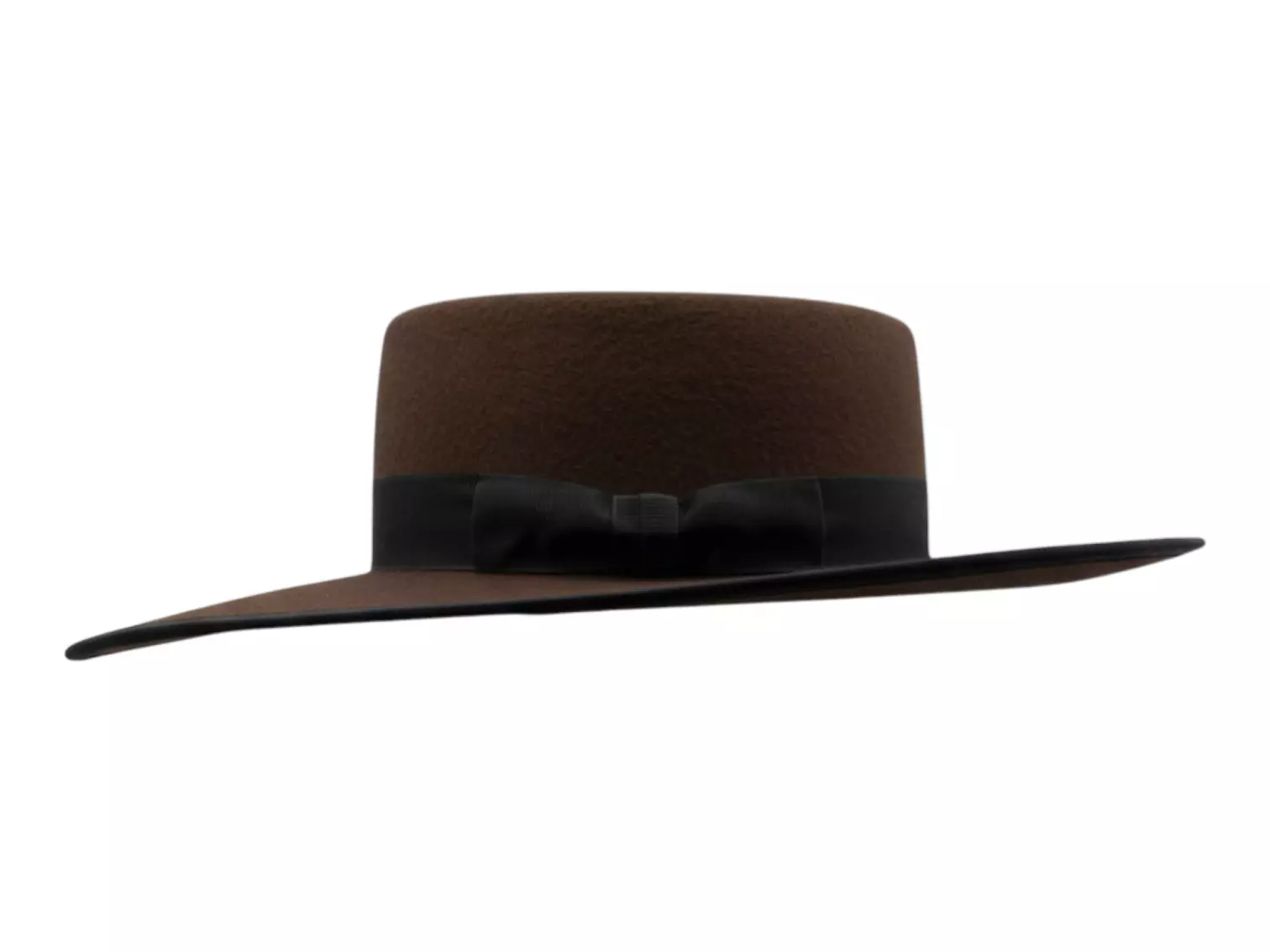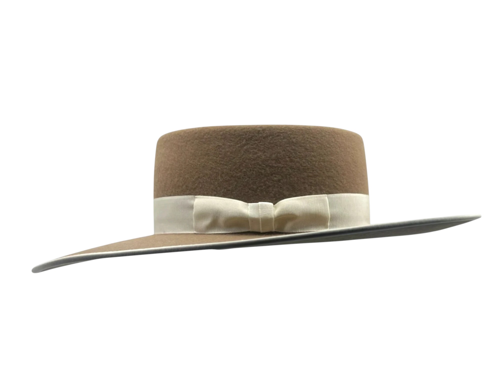 Die flache Westernkrone (ca. 8.5 cm) und der imposante, ca. 10 cm breite Rand verleihen dem Modell eine markante Silhouette – klassisch, authentisch und souverän. Das feine Ripsband mit seitlicher Masche oder Traverse unterstreicht den edlen Charakter. Jeder Hut wird in der Schweizer Hutmanufaktur Risa mit höchster Präzision in aufwendiger Handarbeit gefertigt und veredelt – ein Unikat, das Geschichte erzählt.