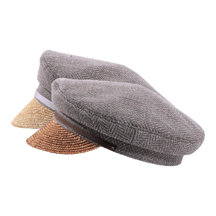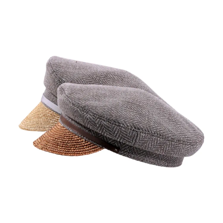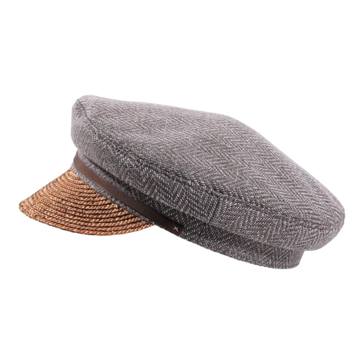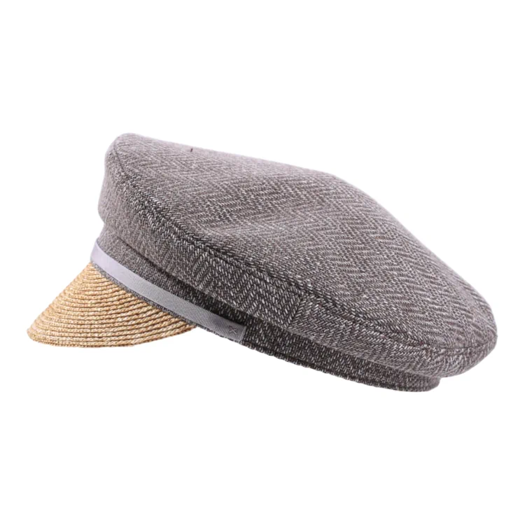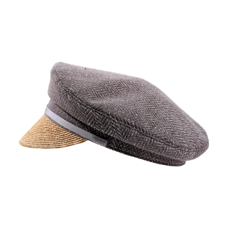 Beschreibung: Sommerliche Schiffermütze mit Schirm aus Weizenstroh und klassischem Oberteil aus Virgin Wool im Fischgratmuster. Erhältlich mit Rebsband in Grau oder Nougat.