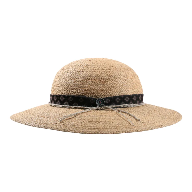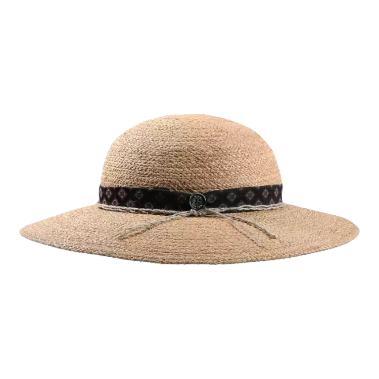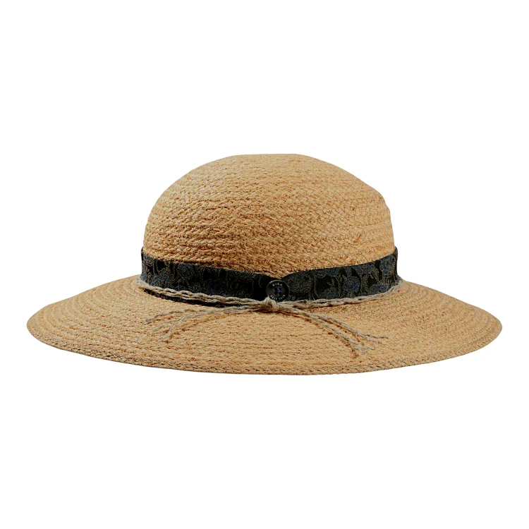 Beschreibung: Naturfarbener Strohhut mit 9 cm breiter Krempe und dekorativem Stoffband, wahlweise Romboid- oder Blumenmotiv, verziert mit Hanfschnur und Qualitätsknopf.