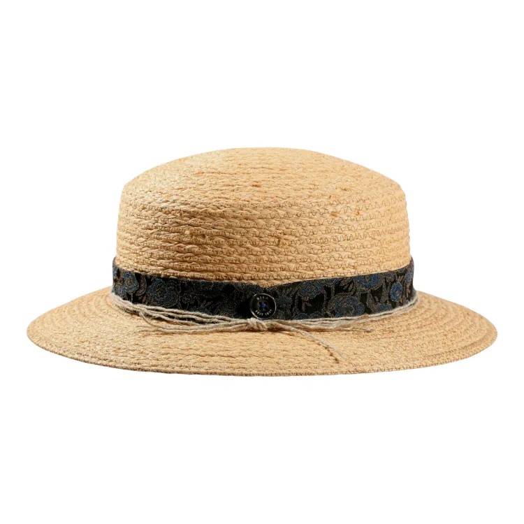 Ein Must-have für die sonnige Jahreszeit: Der Damenhut Cloche Raffia mit Hanfschnur verbindet rustikalen Charme mit elegantem Understatement. Mit seinem kompakten, femininen Cloche-Design und der flachen, rund verlaufenden Krempe ist dieser Hut ein stilsicherer Begleiter für heiße Tage. Der naturfarbene Raffia-Strohton wird durch das kunstvoll gemusterte Stoffband und die dekorative Hanfschnur akzentuiert wahlweise mit Romboid– oder Blumen-Muster, jeweils abgerundet durch den ikonischen Risa seit 1919-Qualitätsknopf. Die fein strukturierte Oberfläche des Hutes und die detailverliebte Garnitur verleihen ihm eine authentisch-handgefertigte Note.