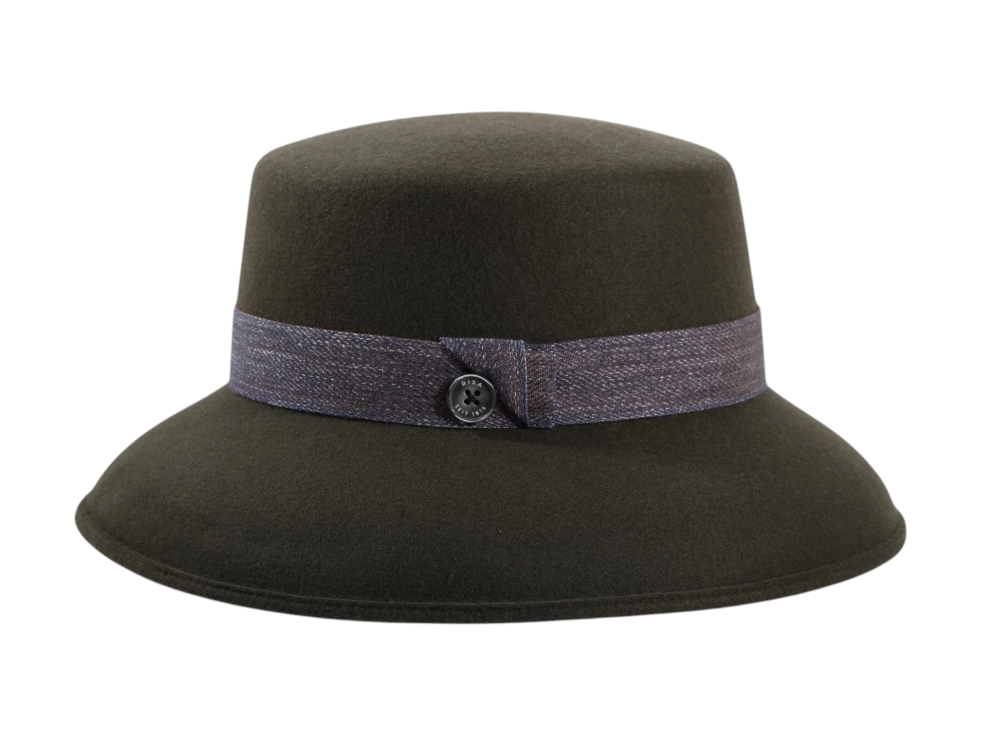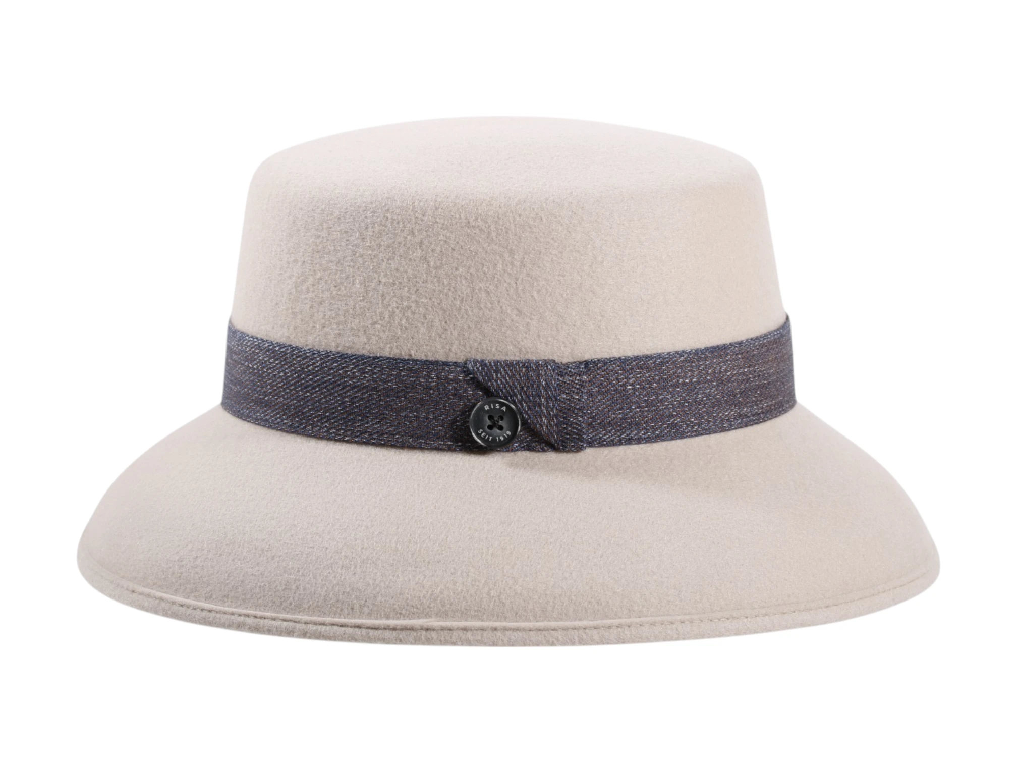 Das Highlight bildet das Hutband aus Denim-Baumwolle, geschmückt mit dem ikonischen „Risa seit 1919“ Qualitätsknopf – ein Symbol für Schweizer Handwerkskunst und Tradition. In den drei Farbvarianten Elfenbein, Himmelblau und Moos wird die Cloche zum vielseitigen Begleiter, der sowohl zu eleganten Mänteln als auch zu modernen Casual-Looks passt.