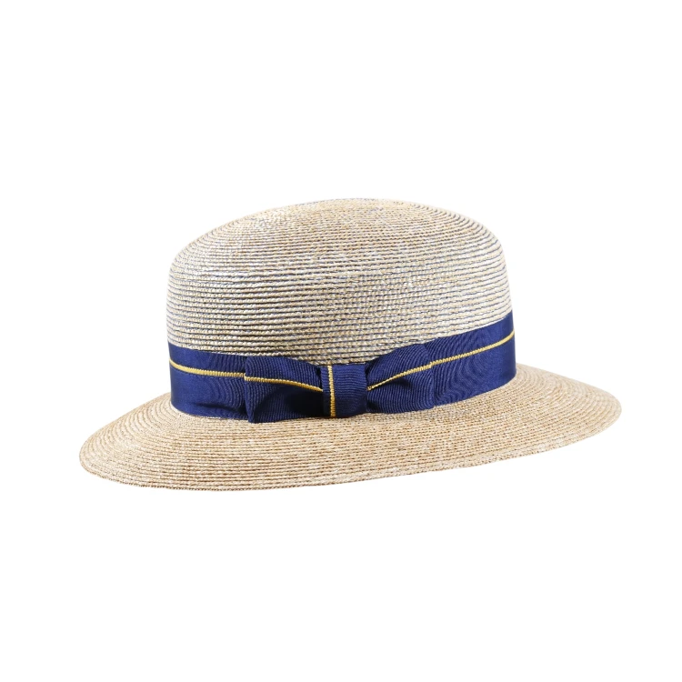 Das “Model Hendschikerin” überzeugt durch seine feine Strohverarbeitung, die harmonische Rundung der Krone und die sanft abfallende Krempe. Die exquisite Garnitur in Blau und Gold unterstreicht die feminine Ausstrahlung und macht den Hut zu einem unverwechselbaren Accessoire.