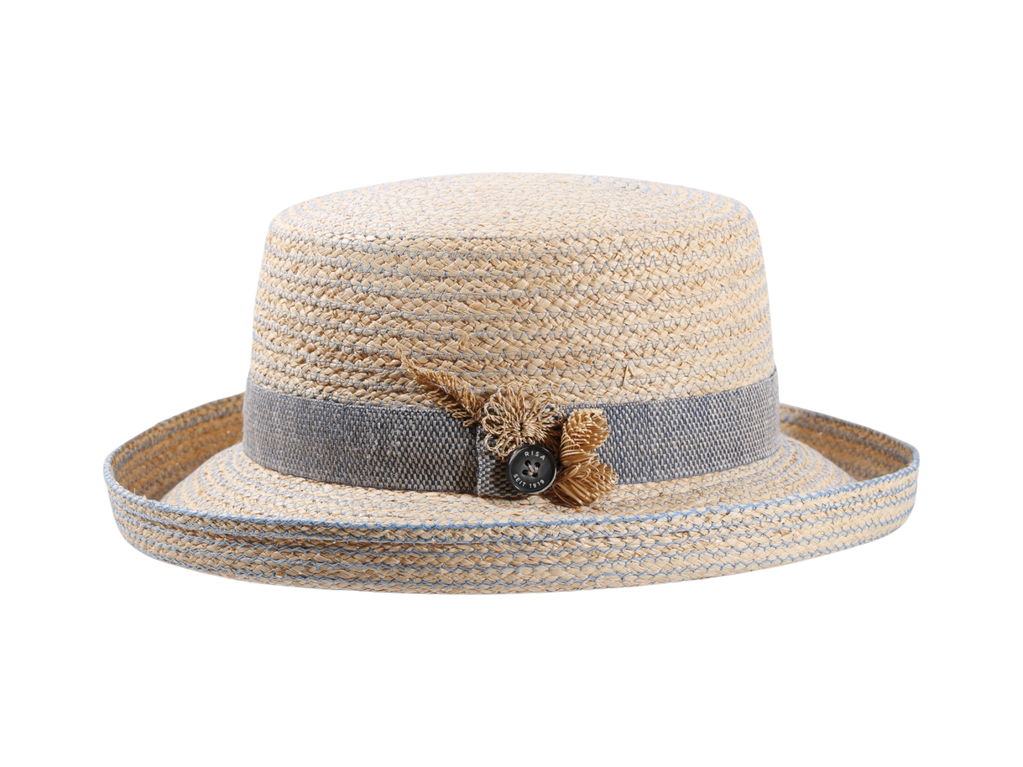 Ein besonderes Highlight ist das hochwertige Leinenband, das je nach Variante in hellblau/weiß oder natur/weiß erhältlich ist. Ergänzt durch kunstvolle Stroh-Agrements und den edlen Risa-Knopf, hebt sich dieses Modell durch seine feinen Details ab. Jeder Hut wird in der Schweizer Hutmanufaktur Risa individuell gefertigt und vereint höchste Handwerkskunst mit nachhaltigen Materialien.