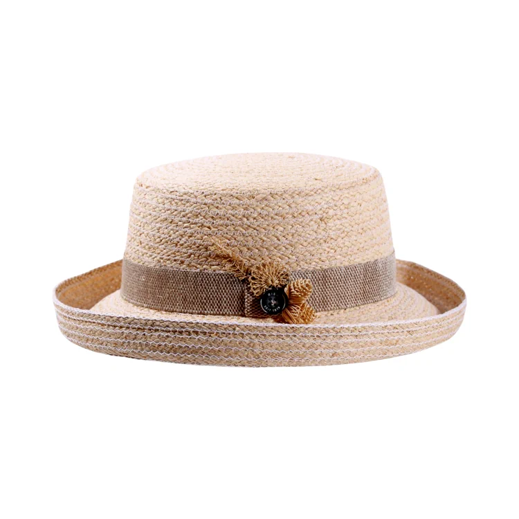 Mit seinem 6,5 cm breiten Rand, der stilvoll aufgeschlagen werden kann, bietet der Damen Aufschlaghut Raffia Strohschmuck einen eleganten Sonnenschutz und eine charmante Silhouette. Die zylindrische Krone mit einer Höhe von 11 cm unterstreicht die klassische Form und sorgt für einen angenehmen Sitz.