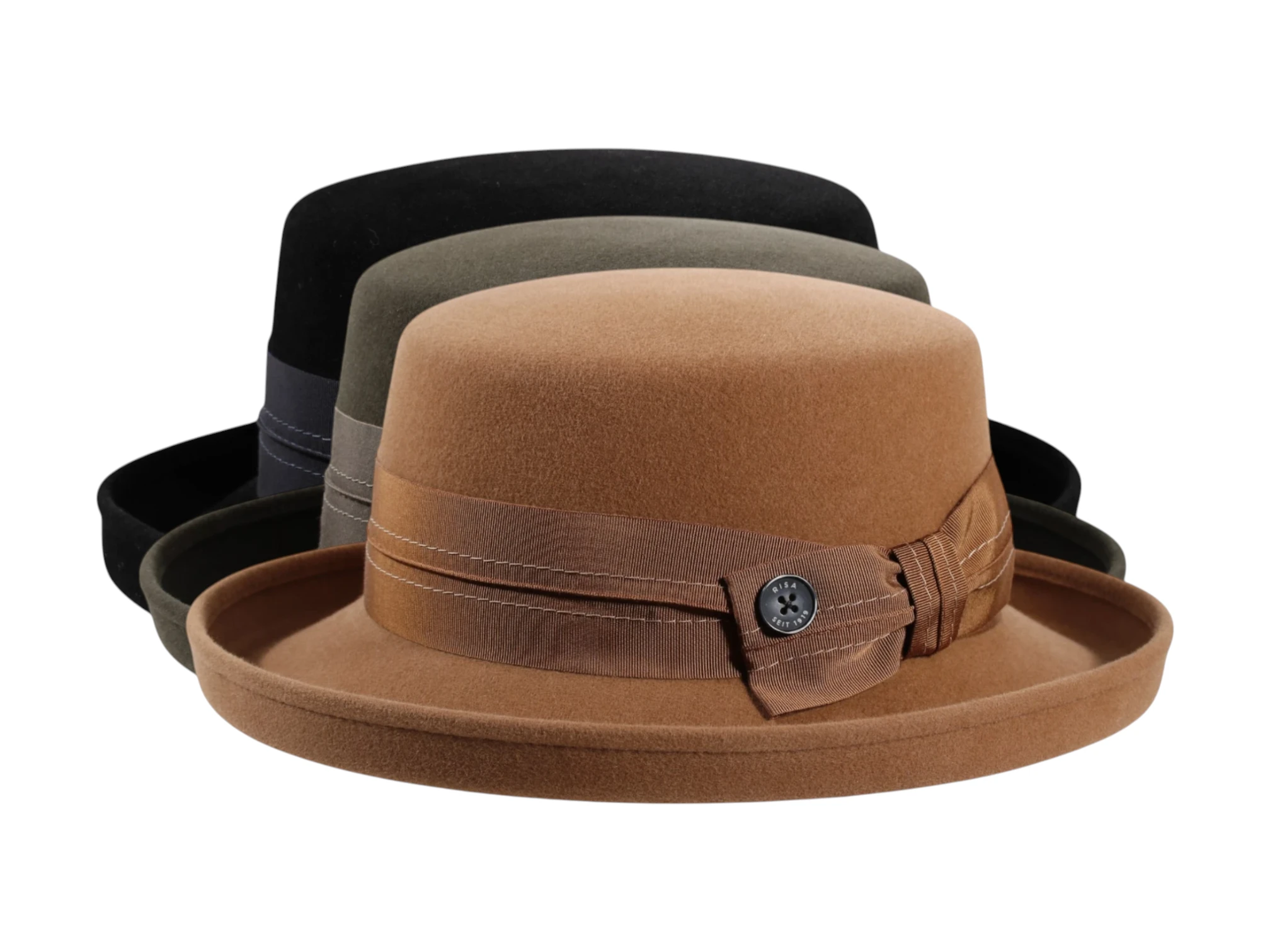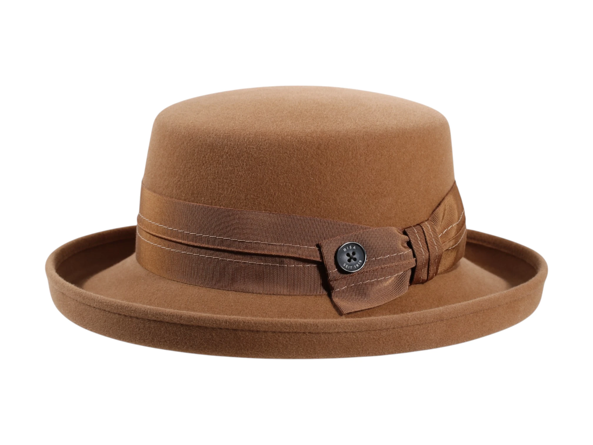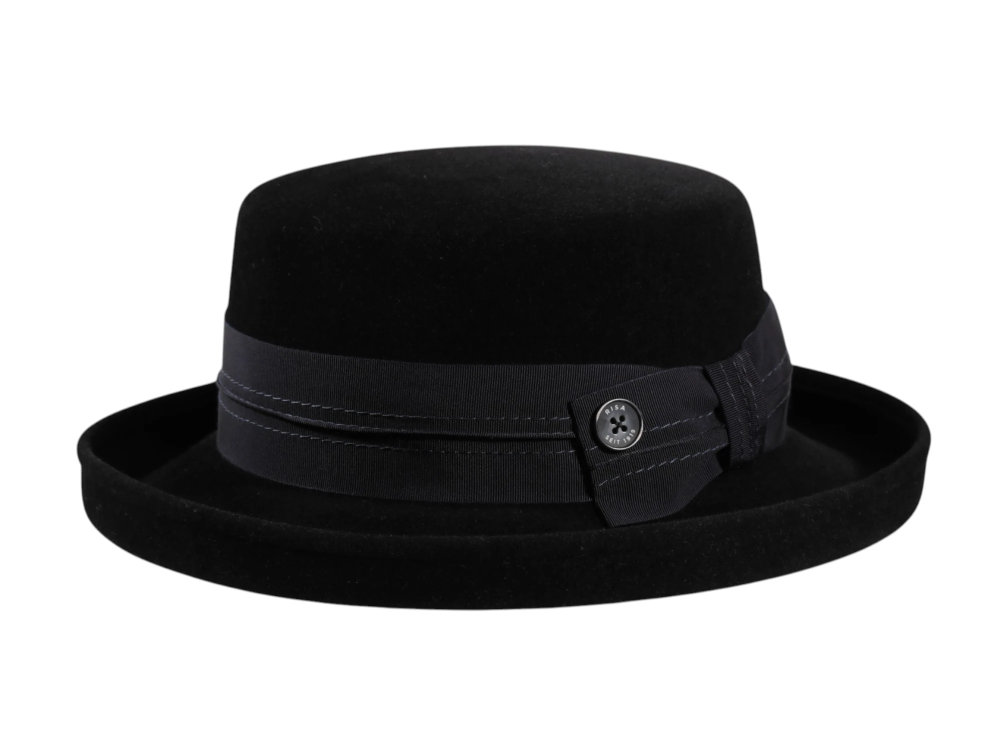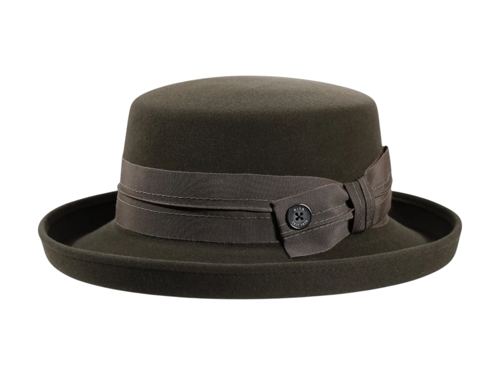 Das Rebsband mit dekorativer Masche und feiner Ziernaht wird durch den ikonischen „Risa seit 1919“ Qualitätsknopf vollendet – ein dezentes, aber unverkennbares Markenzeichen Schweizer Hutmacherkunst. Erhältlich in den stilvollen Farbvarianten Schwarz, Camel und Moos, passt dieser Hut sowohl zu klassischen Mänteln als auch zu modernen Outfits. Handgefertigt in der traditionsreichen Risa Hutmanufaktur im Freiamt (Schweiz), ist dieser Aufschlaghut Teil der Premium Herbst-/Winter-Kollektion – ein Meisterstück für höchste Ansprüche an Stil, Qualität und Exklusivität.