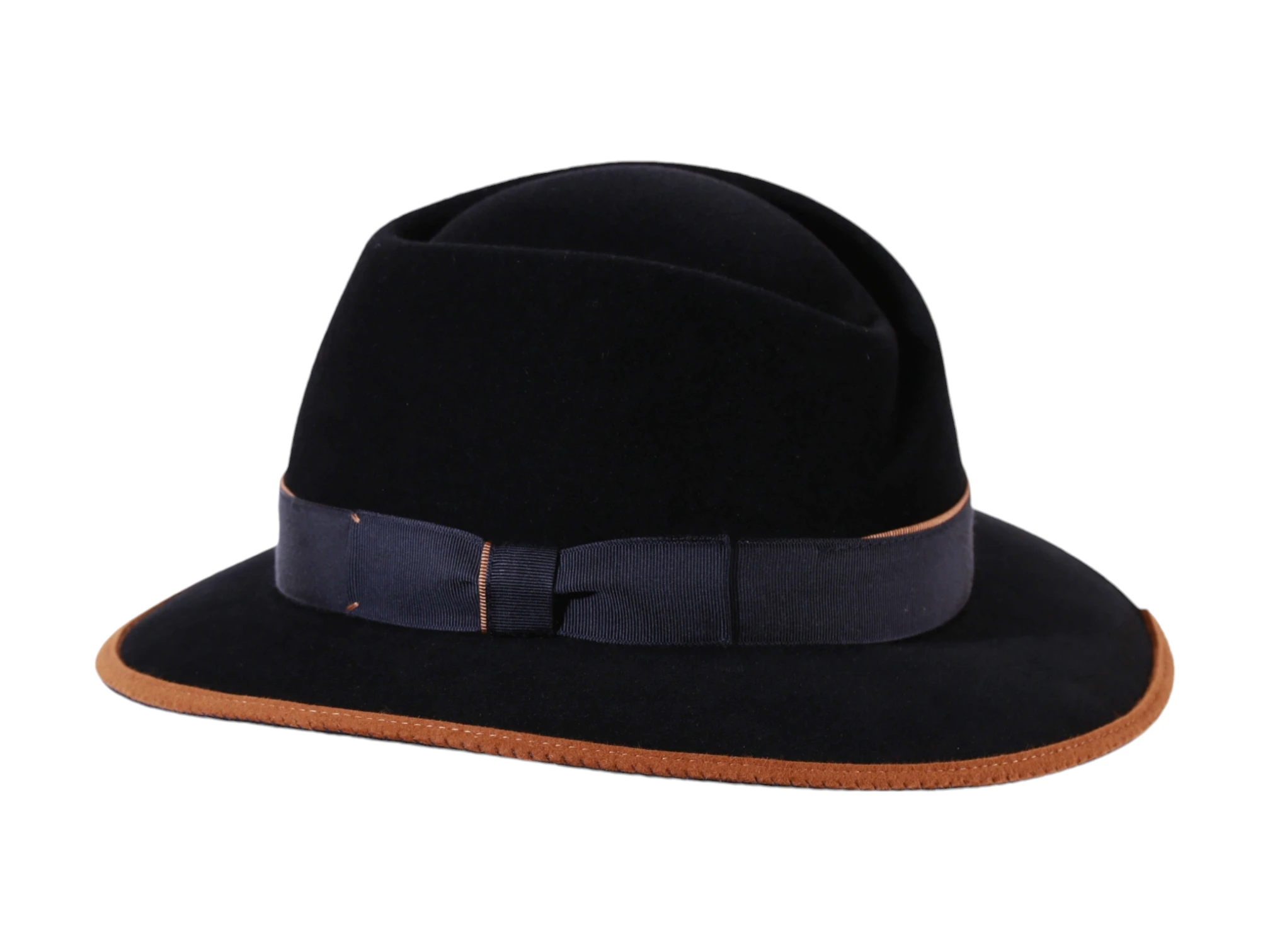 Der Hut Schweiz steht für exklusive Handarbeit und zeitlose Ästhetik. Gefertigt aus 100% Velours-Haarfilz, bietet dieser Hut eine weiche, luxuriöse Haptik und optimalen Schutz vor Wind und Wetter. Seine schlichte Form wird durch die feine marineblaue Garnitur aus Rebsband, die mit einer Schlaufe und Passepoile abgerundet ist, dezent aufgewertet. Der orangefarbene Filzeinsatz verleiht dem Hut einen subtilen Farbakzent, der ihm zusätzlichen Charakter verleiht.