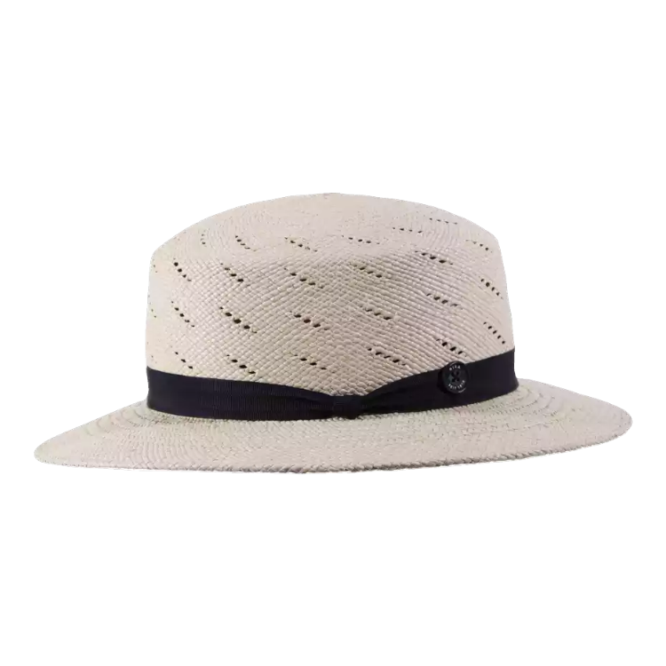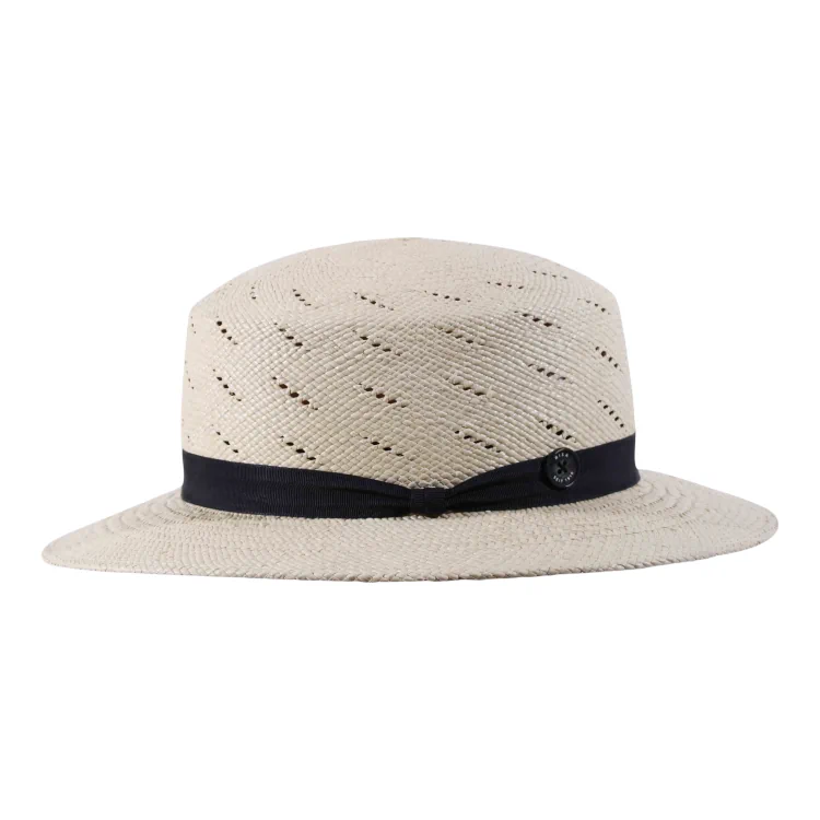 Dieses Modell überzeugt durch seine klassische Cloche-Form mit sanft gewölbter Krone und moderater Krempenweite von 6 cm feminin, vielseitig kombinierbar und gleichzeitig funktional. Die charakteristische Linienbelüftung ist nicht nur ein optisches Highlight, sondern sorgt auch an heissen Tagen für angenehme Luftzirkulation. Gekrönt wird das Design durch ein marineblaues Rebsband mit dekorativer Masche und dem ikonischen Risa seit 1919-Knopf ein Zeichen für authentische Handwerkskunst.