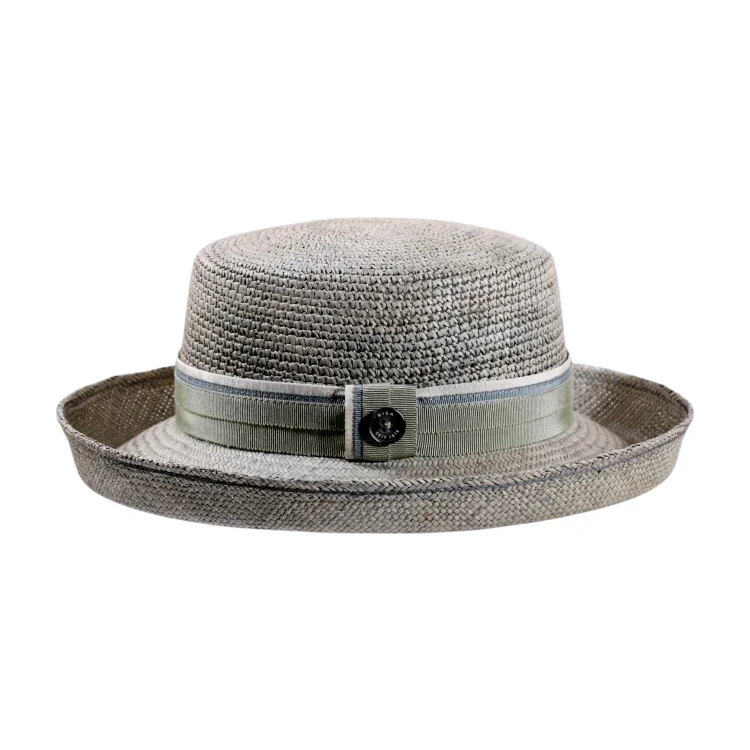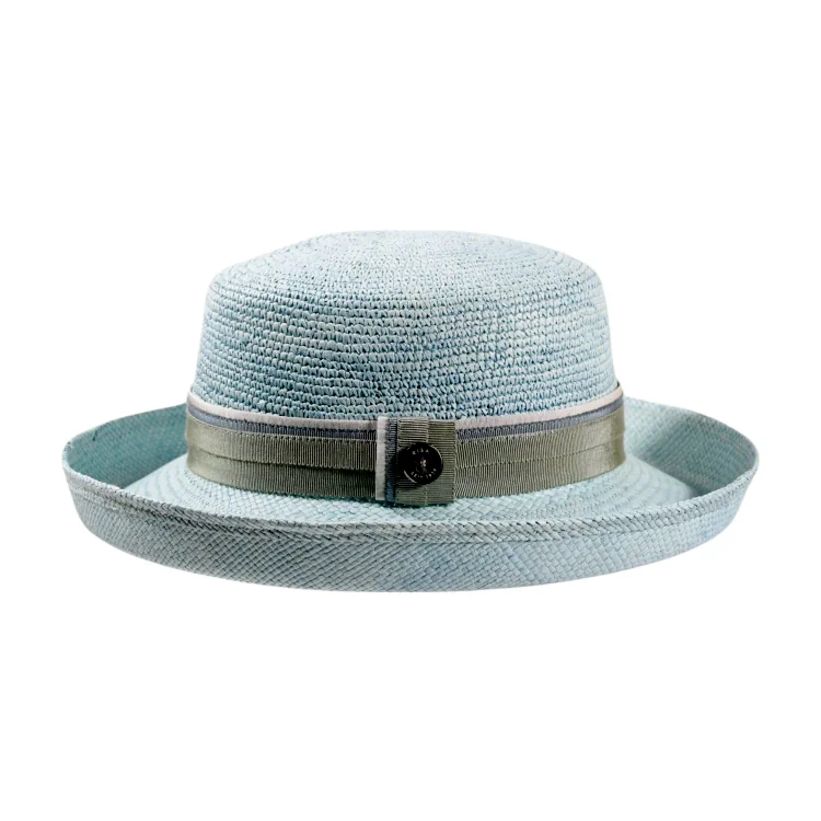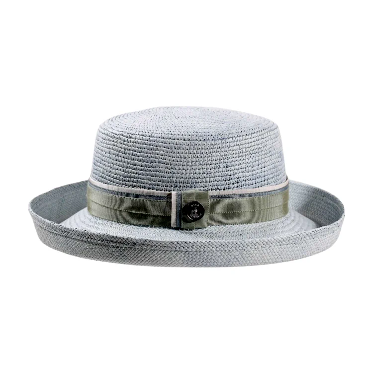 Die elegante Häkeltechnik verleiht dem Hut eine besonders feine, leicht durchscheinende Struktur. Das kontrastierende Hutband aus Leinen mit grosgrain-ähnlichen Details setzt dezente Farbakzente, während der eingearbeitete Qualitätsknopf von Risa auf den hohen Verarbeitungsstandard hinweist. Die aufgeschlagene Krempe rundet das Design harmonisch ab und unterstreicht den femininen Charakter dieses Modells.