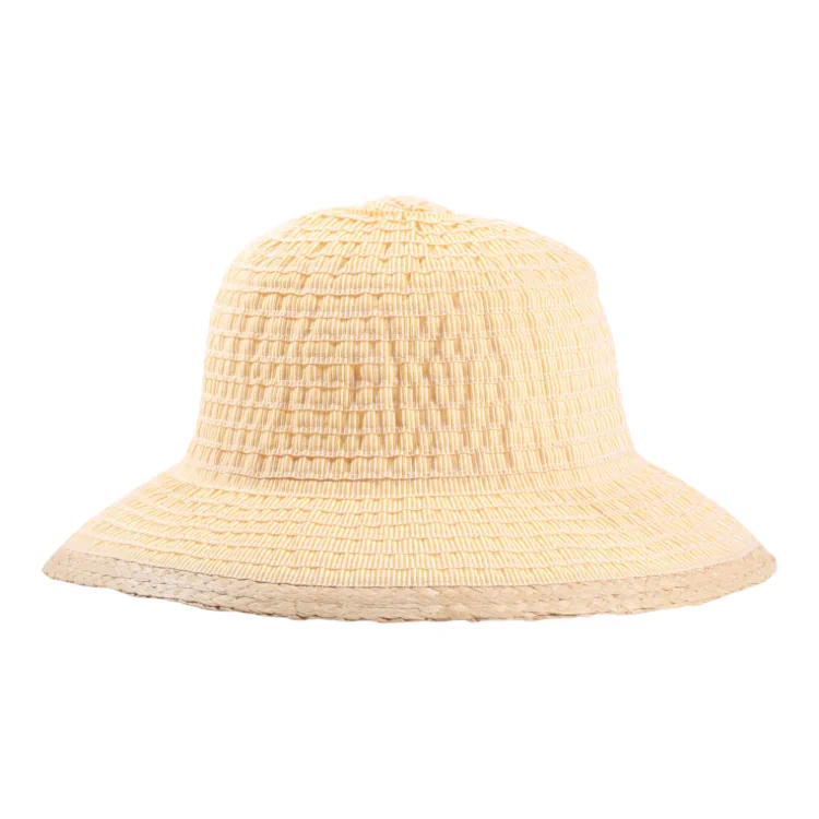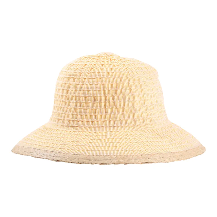 Die charmante Cloche-Form des Hutes betont die feminine Silhouette und umschmeichelt das Gesicht mit einer sanften Rundung. Der breite Rand mit naturfarbener Umrandung verleiht dem Design eine natürliche Note und schützt gleichzeitig zuverlässig vor intensiver Sonneneinstrahlung. In den Farben Gelb, Lachs und Ciel erhältlich, passt der Hut sowohl zu hellen Sommerkleidern als auch zu lässigen Strandoutfits.