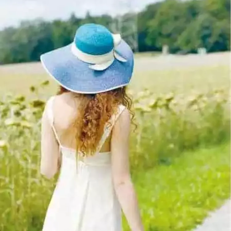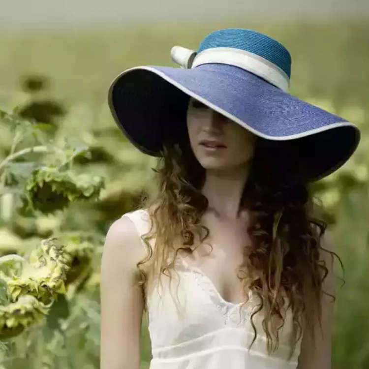 Das eingefasste weiße Strohhutband mit stilvoller Schlaufe betont die feminine Silhouette und verleiht dem Hut eine leichte, fast poetische Ausstrahlung. Die sanfte Wellenform der Krempe mit einer Randbreite von bis zu 14,5 cm sorgt für optimalen Sonnenschutz und einen unverwechselbaren Look.