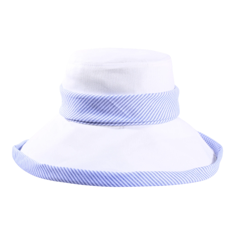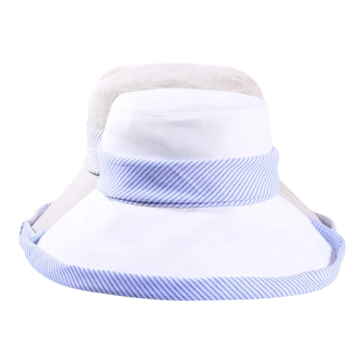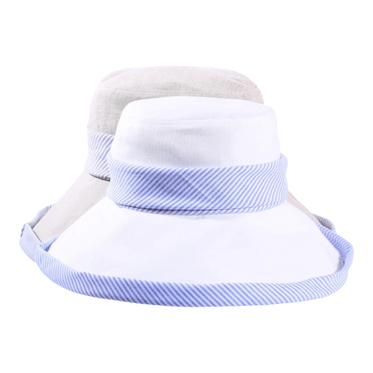 Die Kombination aus Leinen und Baumwolle sorgt für ein angenehmes, atmungsaktives Tragegefühl. Der Sommerhut Tiffany ist in zwei Farbvarianten erhältlich: Reinweiß für einen strahlend frischen Look und Hellbeige für eine dezente, natürliche Note. Das breite, gestreifte Leinenband in sanftem Blau verleiht diesem Modell einen maritimen Charme und macht es vielseitig kombinierbar.