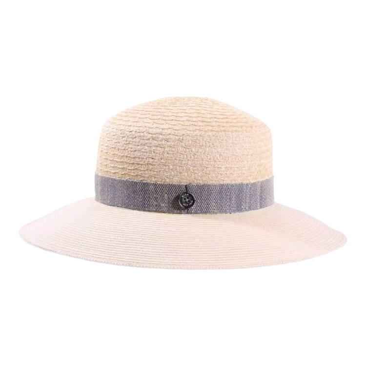 Ein stilvoller Kontrast: Das breite Leinenhutband in einem sanften Ciel-Ton, das den Naturfarbton des Huts unterstreicht und durch einen seitlich platzierten RISA seit 1919-Knopf ein dezentes Statement setzt.