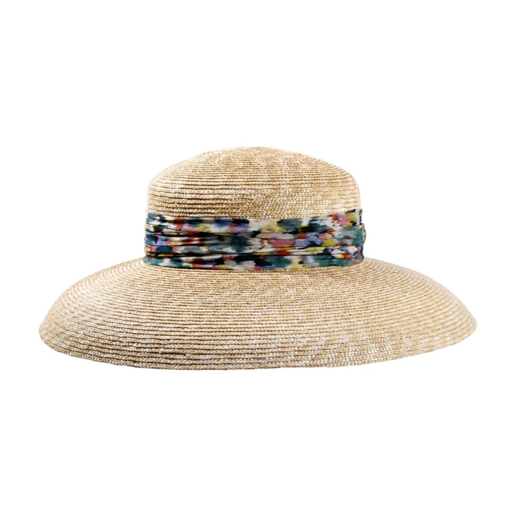 Die Cloche Audrey besticht durch ihre schlichte Eleganz und die besondere Verarbeitung des Weizenstrohs, das in feinstem Handwerk geformt wird. Das florale Band aus hochwertigen Materialien unterstreicht das kunstvolle Design und verleiht der Hütte einen frischen, modernen Look. Jedes Detail dieses Hutes ist ein Beweis für die meisterhafte Kunstfertigkeit der Schweizer Hutmanufaktur Risa.