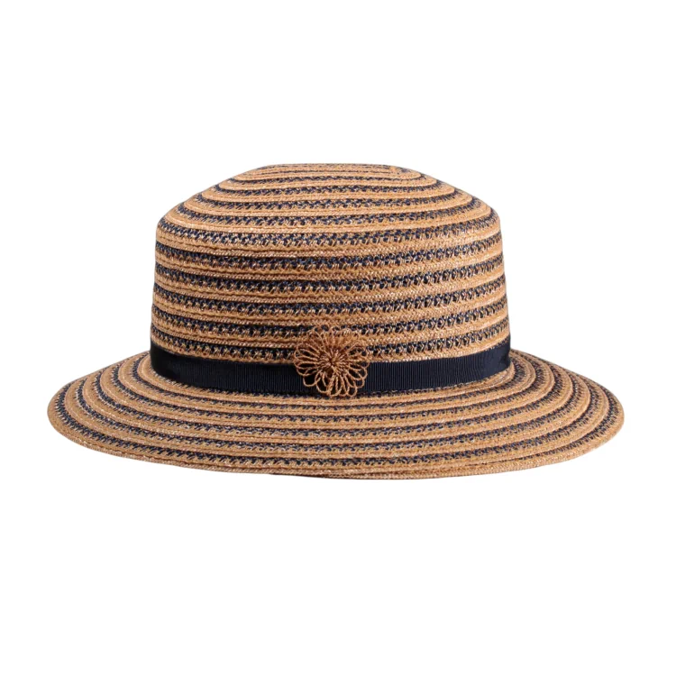 Auf den Bildern zeigen sich die Varianten in Weiß, Nougat und Navy jede Version überzeugt durch ihre eigene Eleganz. Das farblich abgestimmte Rebs-Hutband wird von einer filigranen, handgefertigten Strohblume akzentuiert und macht den Hut zu einem einzigartigen Hingucker.