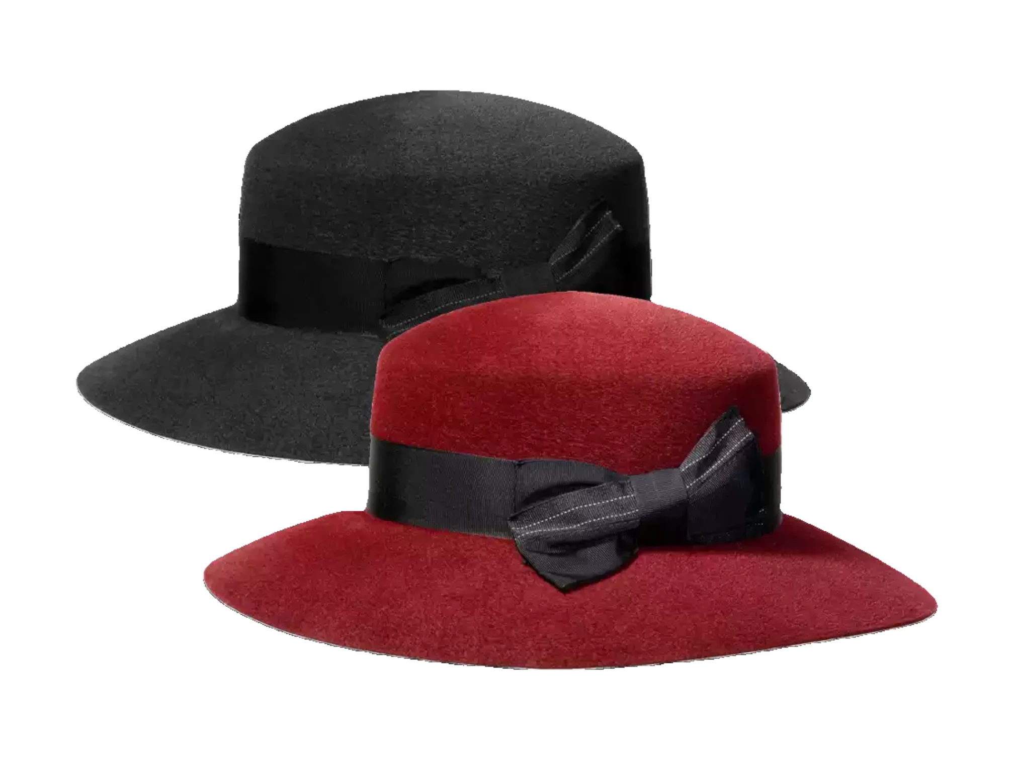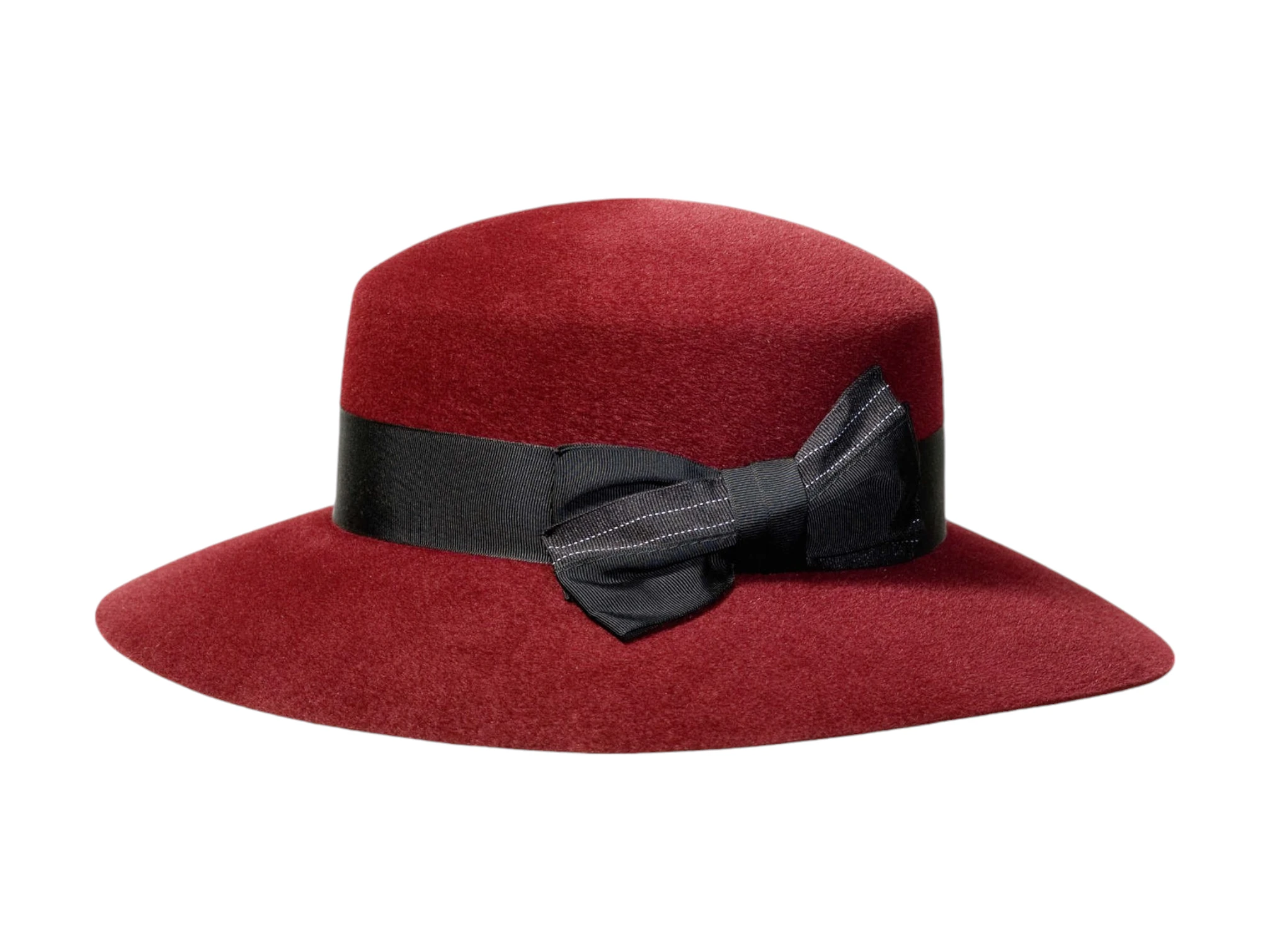 Der Hut ist in Bordeaux mit schwarzem Rebsband und Nadelstreifen sowie in Schwarz mit schwarzem Rebsband und Nadelstreifen erhältlich.