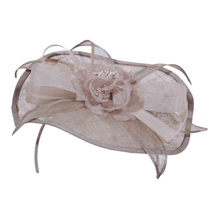 Die kunstvoll gearbeitete Schleife wird von einer zarten Blütenapplikation mit filigranen Blütenstempeln ergänzt, die dem Design eine feenhafte Anmutung verleiht. Durch das edle Material aus 100 % Sisal wirkt dieser Fascinator nicht nur besonders hochwertig, sondern ist auch angenehm leicht zu tragen.
