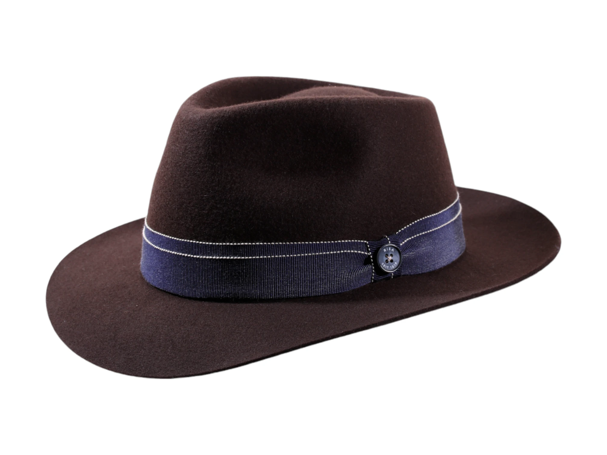 Gefertigt aus 100% hochwertigem Wollfilz, besticht dieser Fedora durch seine weiche Haptik, Formstabilität und Langlebigkeit. Besonderes Highlight ist das Hutband aus Rebs, ergänzt durch einen feinen Grosgrain-Streifen mit dekorativer Traverse. Abgerundet wird die Garnitur durch den ikonischen Qualitätsknopf mit der Aufschrift „Risa seit 1919“ – ein Symbol für Schweizer Präzision und Tradition.