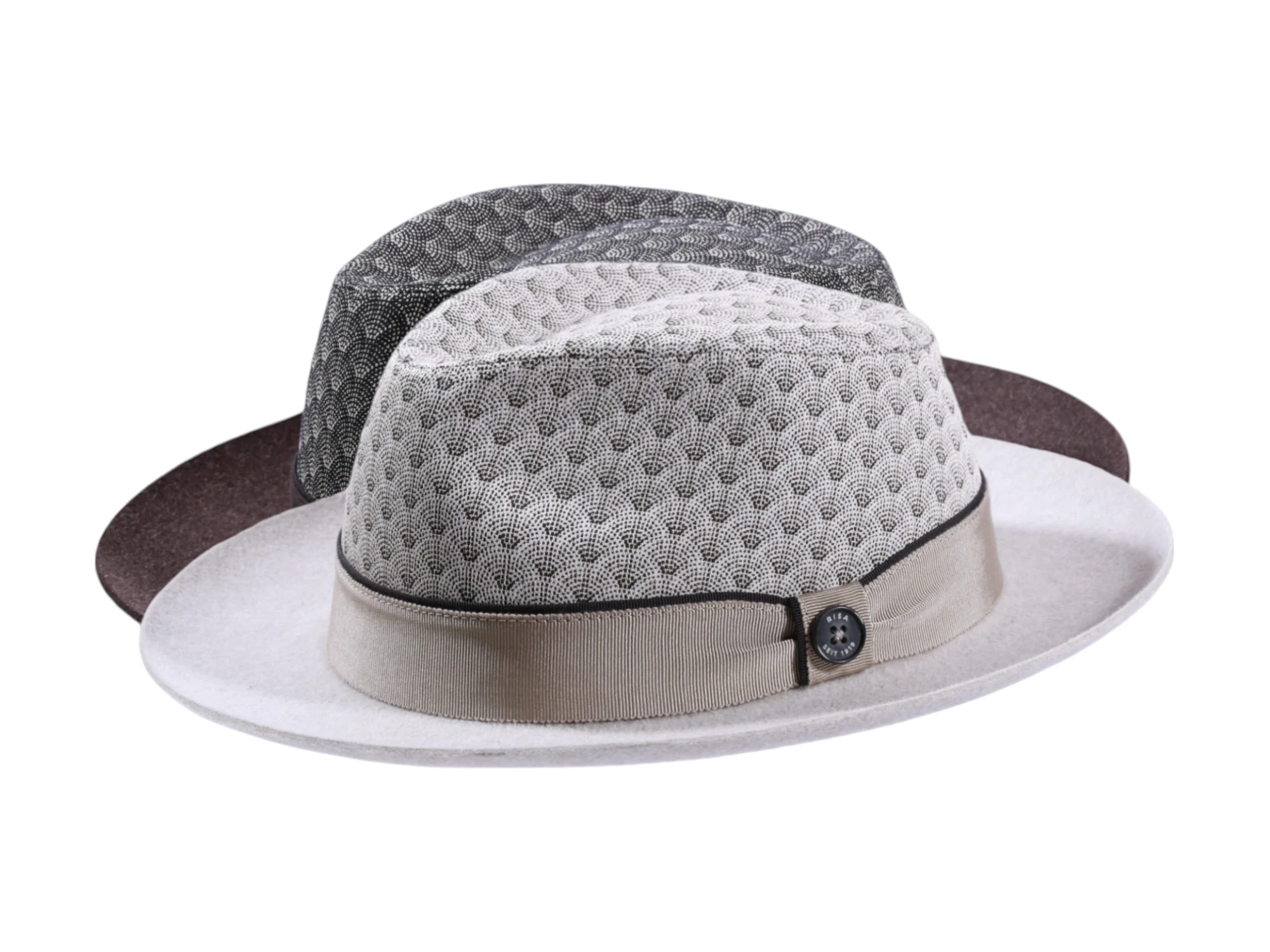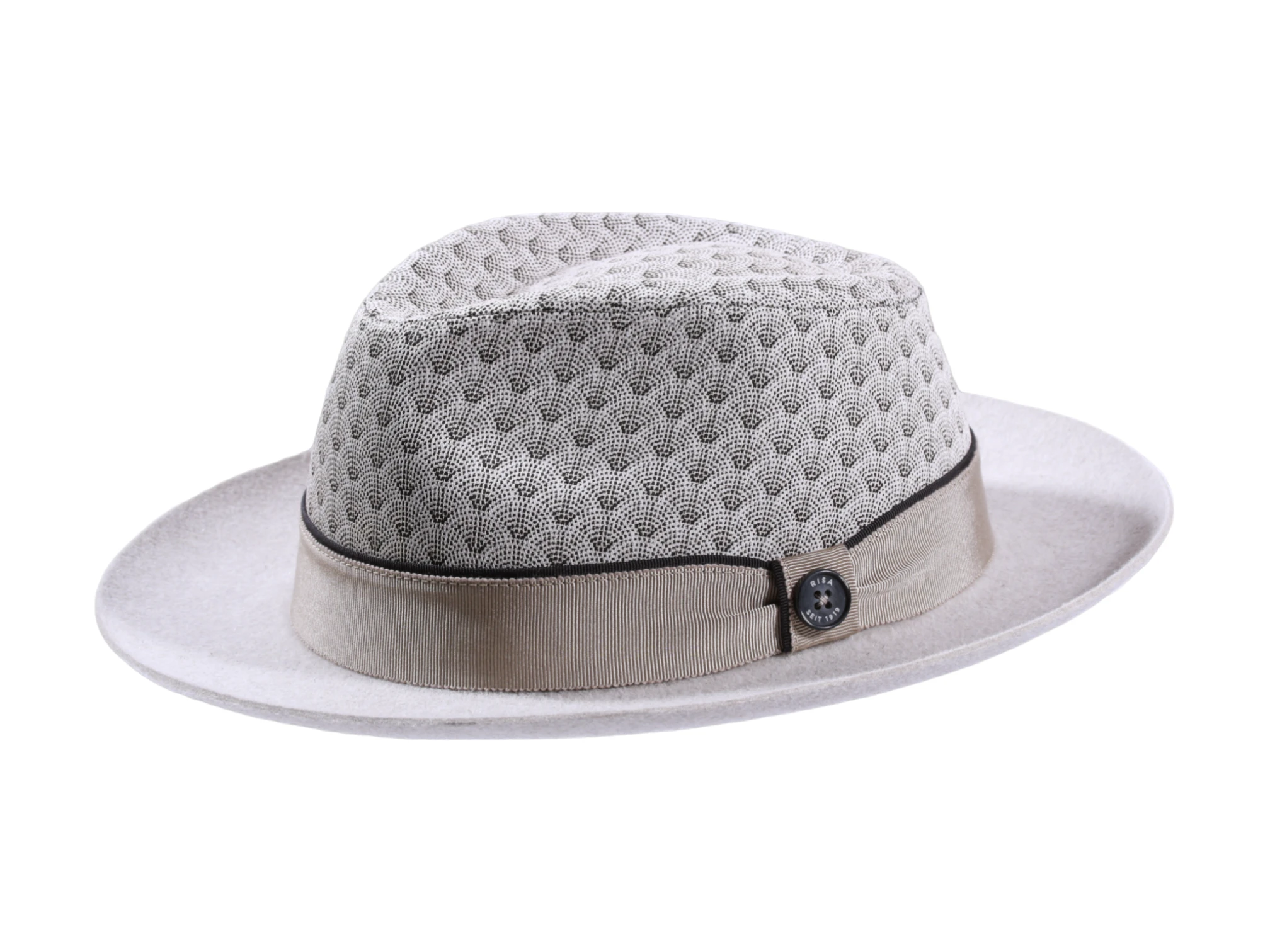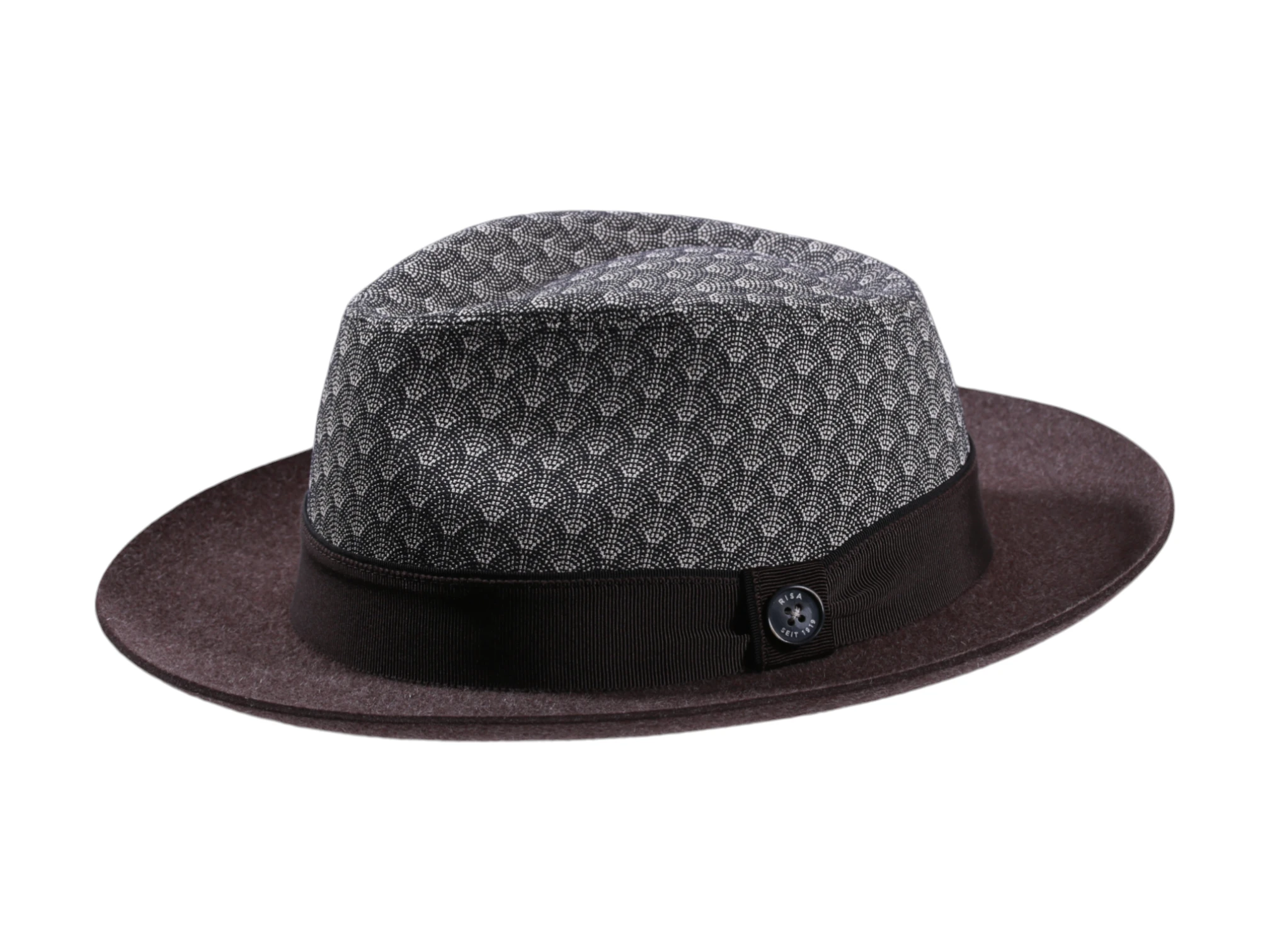 Die Krone von 10,5 cm Höhe und die fein proportionierte Krempe von 6 cm verleihen dem Hut eine klare, charakterstarke Silhouette. Gefertigt aus einer Kombination von 50% Haarfilz und 50% Textil, begeistert dieses Modell durch seine extravagante Struktur: Die Krone ist mit einem detailreichen Poispoil-Muster versehen, das subtile Art-déco-Ästhetik mit zeitloser Eleganz verbindet.