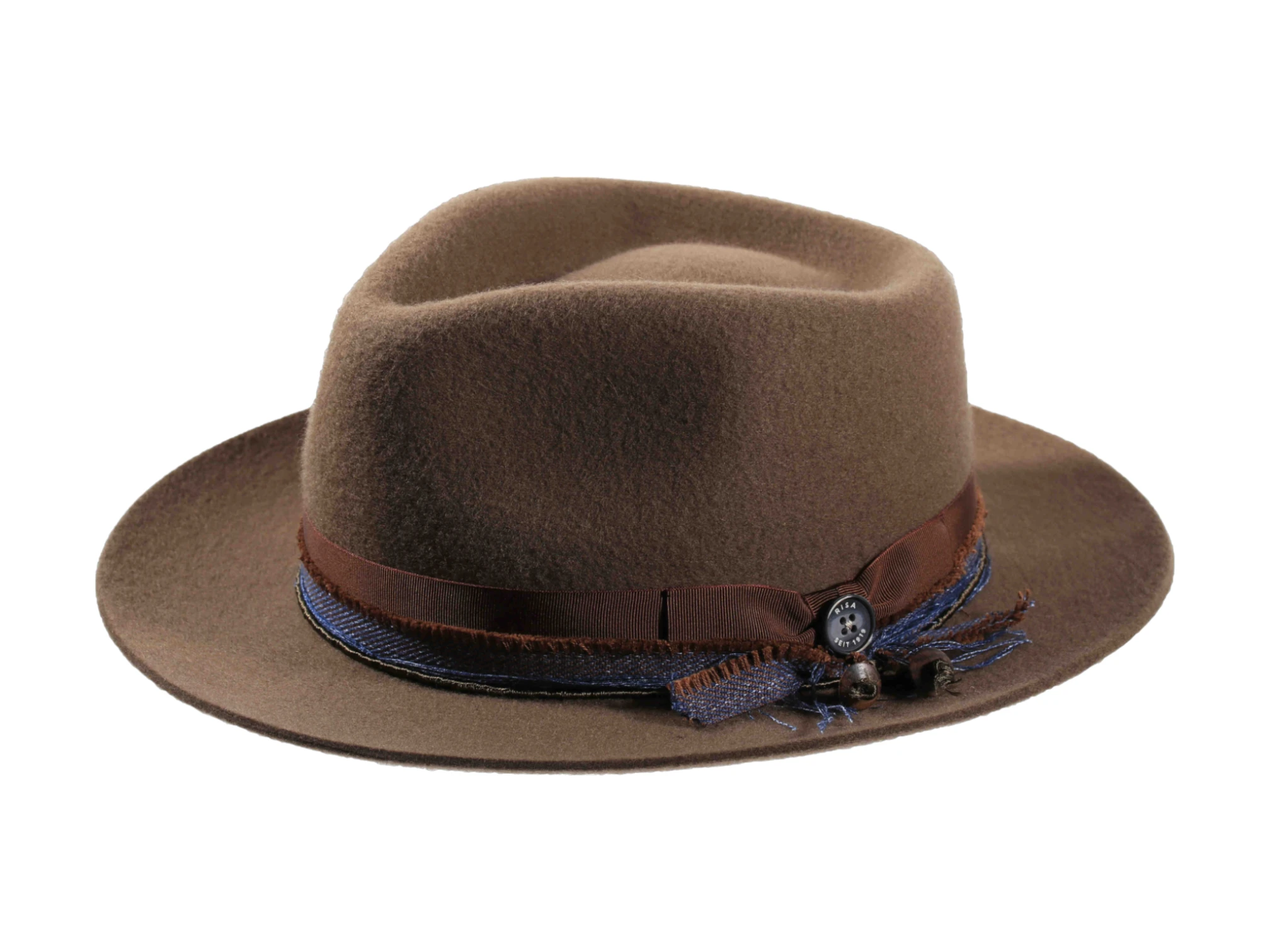 Gefertigt aus 100% edlem Wollfilz überzeugt dieser Fedora mit klarer Silhouette, einer ca. 6 cm breiten Krempe und einer Kopfhöhe von ca. 10,5 cm. Sein Highlight ist die exklusive Garnitur: ein braunes Rebsband, kombiniert mit Denim-Details und Ebenholzperlen, die dem Hut einen modernen, zugleich naturverbundenen Charakter verleihen. Abgerundet wird die Verzierung durch eine feine Masche und den ikonischen „Risa seit 1919“-Knopf.