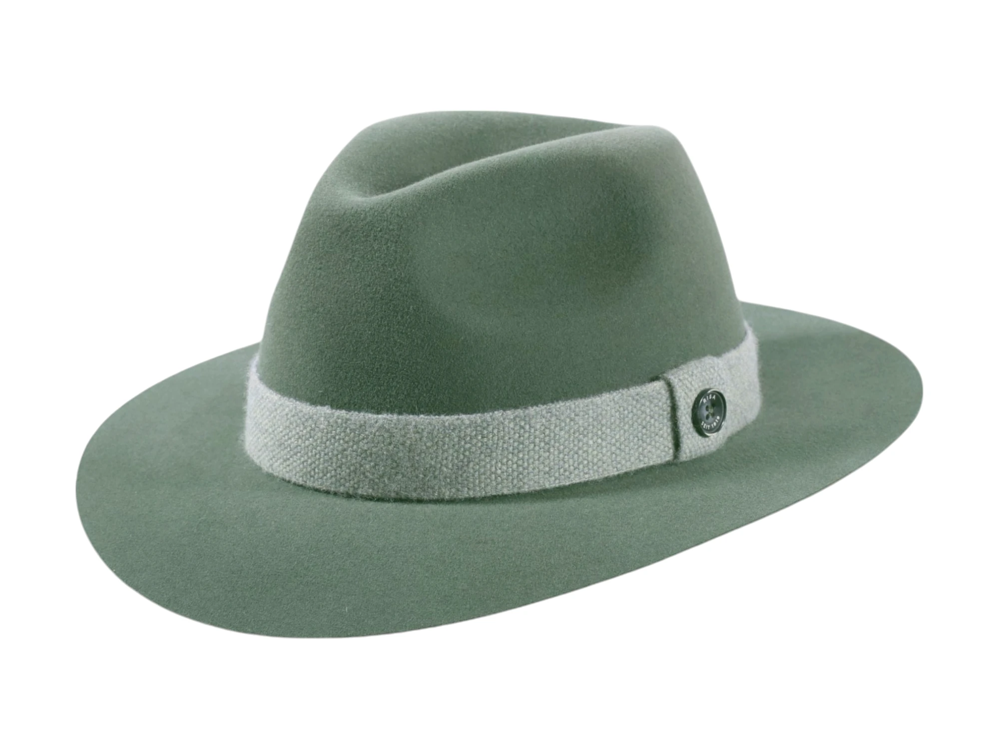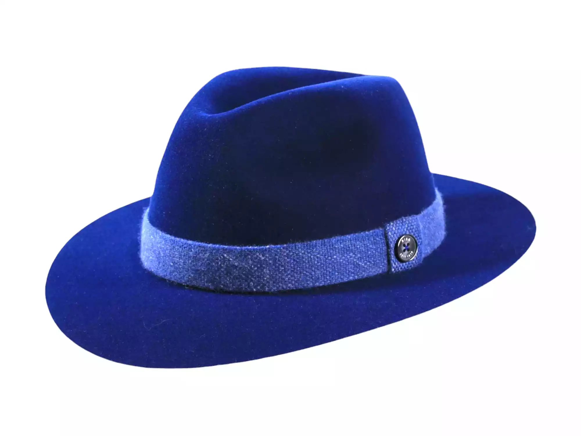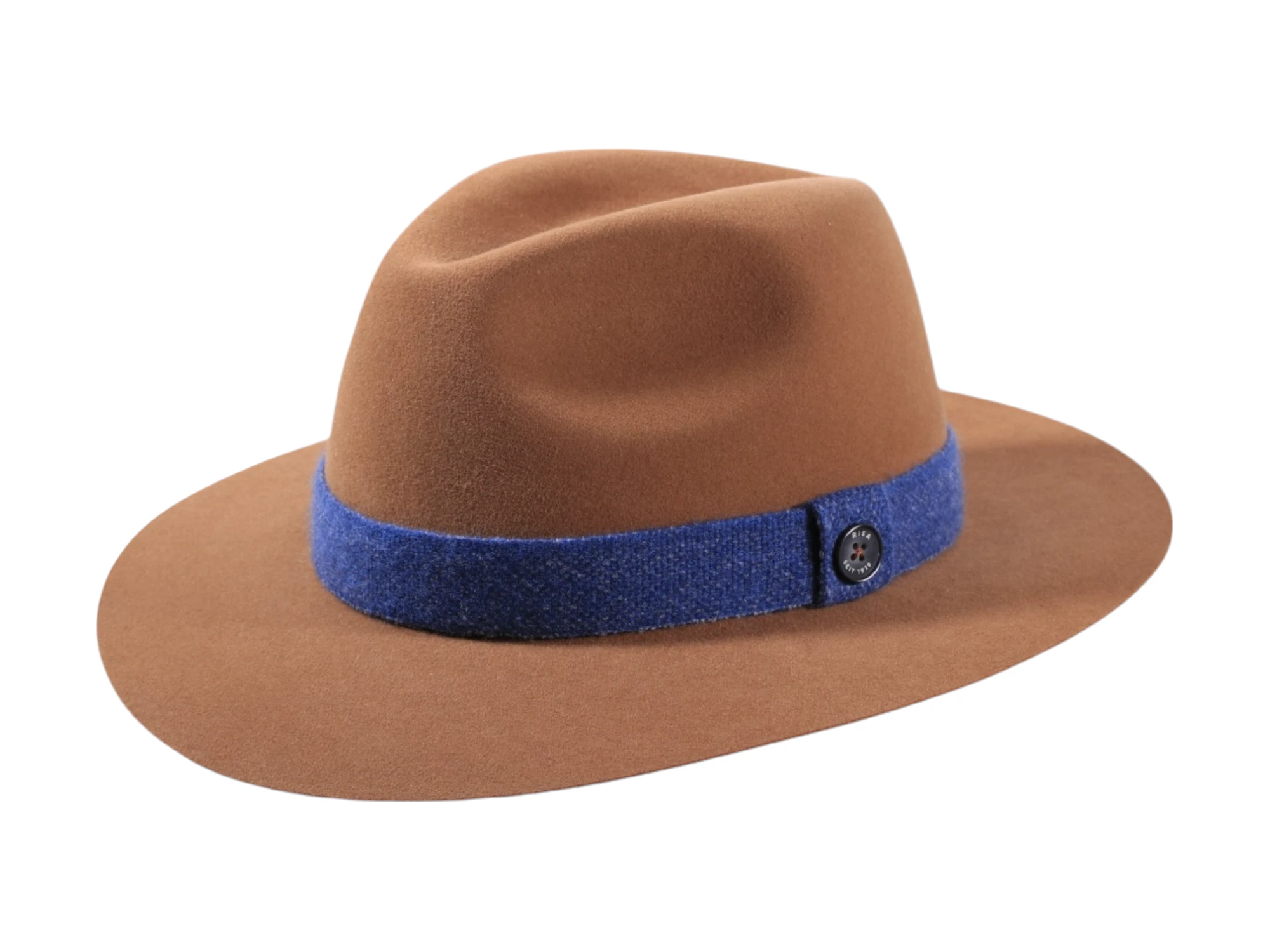 Die Farbkombinationen – Camel mit Jeansblau, Leucht-Marine mit Jeansblau oder Kaperngrün mit Salbei – verleihen dem Hut eine zeitgemäße Note. Das Wollband mit ikonischem „Risa seit 1919“-Knopf rundet das Design als unverkennbares Qualitätsmerkmal ab.