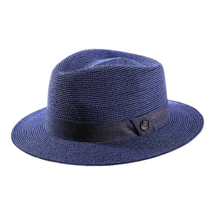 Die sanft geschwungene Krone und die klare Fedora-Linie verleihen diesem Sommerhut eine zeitlose Silhouette. Die dezente Farbigkeit ob Vanille, Nougat, Marine oder Silber harmoniert perfekt mit dem tiefblauen Baumwollband, das sich diagonal an der Krone schmiegt und mit dem ikonischen Risa seit 1919-Knopf signiert ist. Die feine Flechtung des Hanfmaterials verleiht dem Hut eine lebendige Textur, die sowohl luftdurchlässig als auch UV-schützend wirkt. Das integrierte Textilinnenband sorgt für ein angenehmes Tragegefühl auch an langen Sommertagen.