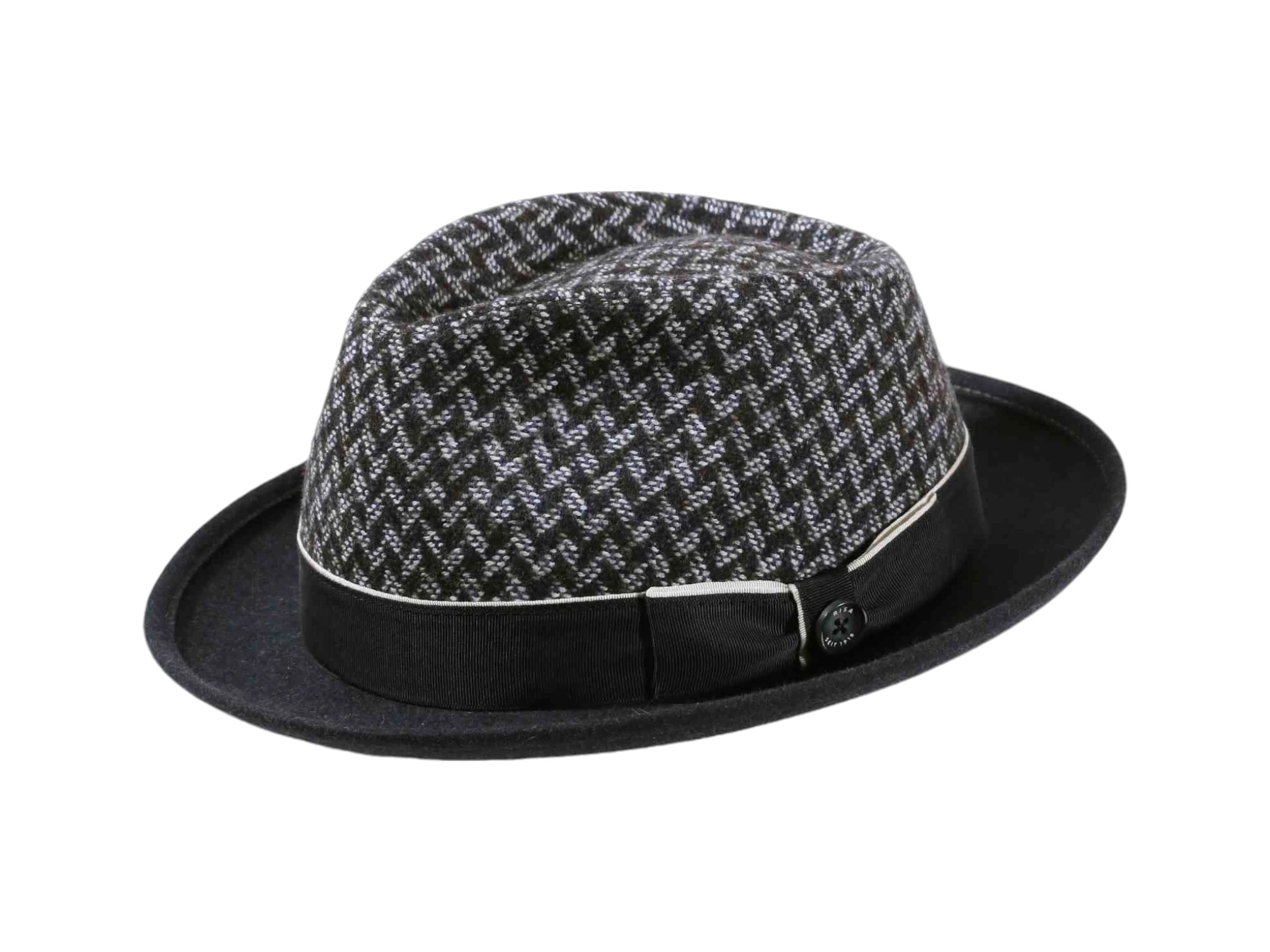 Der Player/Trilby mit Klapprand ist ein echter Hingucker und kombiniert elegantes Design mit handwerklicher Perfektion. Gefertigt aus 100 % Haarfilz Melousine, zeichnet sich dieser Hut durch seine samtig-weiche Textur und exzellente Formstabilität aus. Der Hutkopf besticht durch ein einzigartiges Zickzackmuster in Marineblau und Natur, während der Hutrand in schlichtem Marineblau Uni gehalten ist. Diese Kombination aus Struktur und Schlichtheit macht diesen Player-Hut besonders vielseitig und modisch.