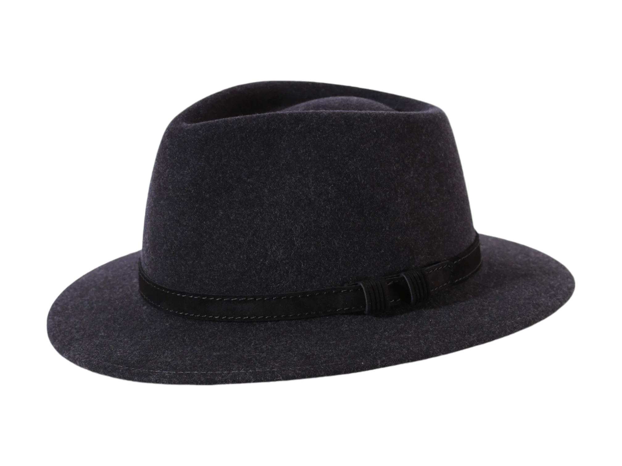 Der Hut ist in meliertem Dunkelgrau mit schwarzem Echtlederband erhältlich.