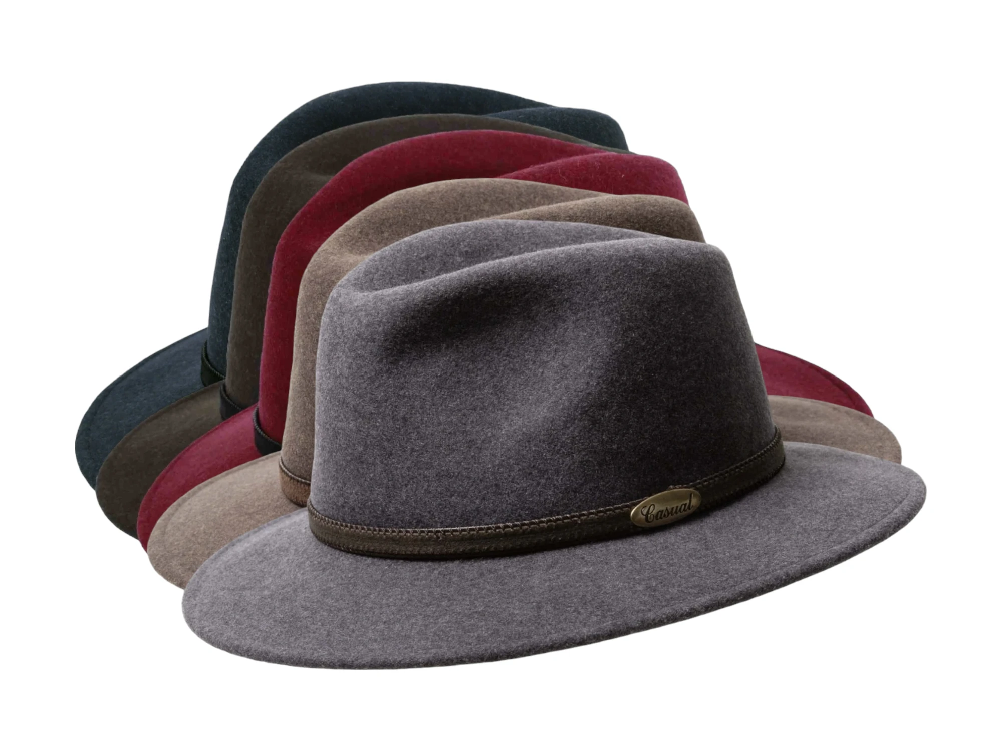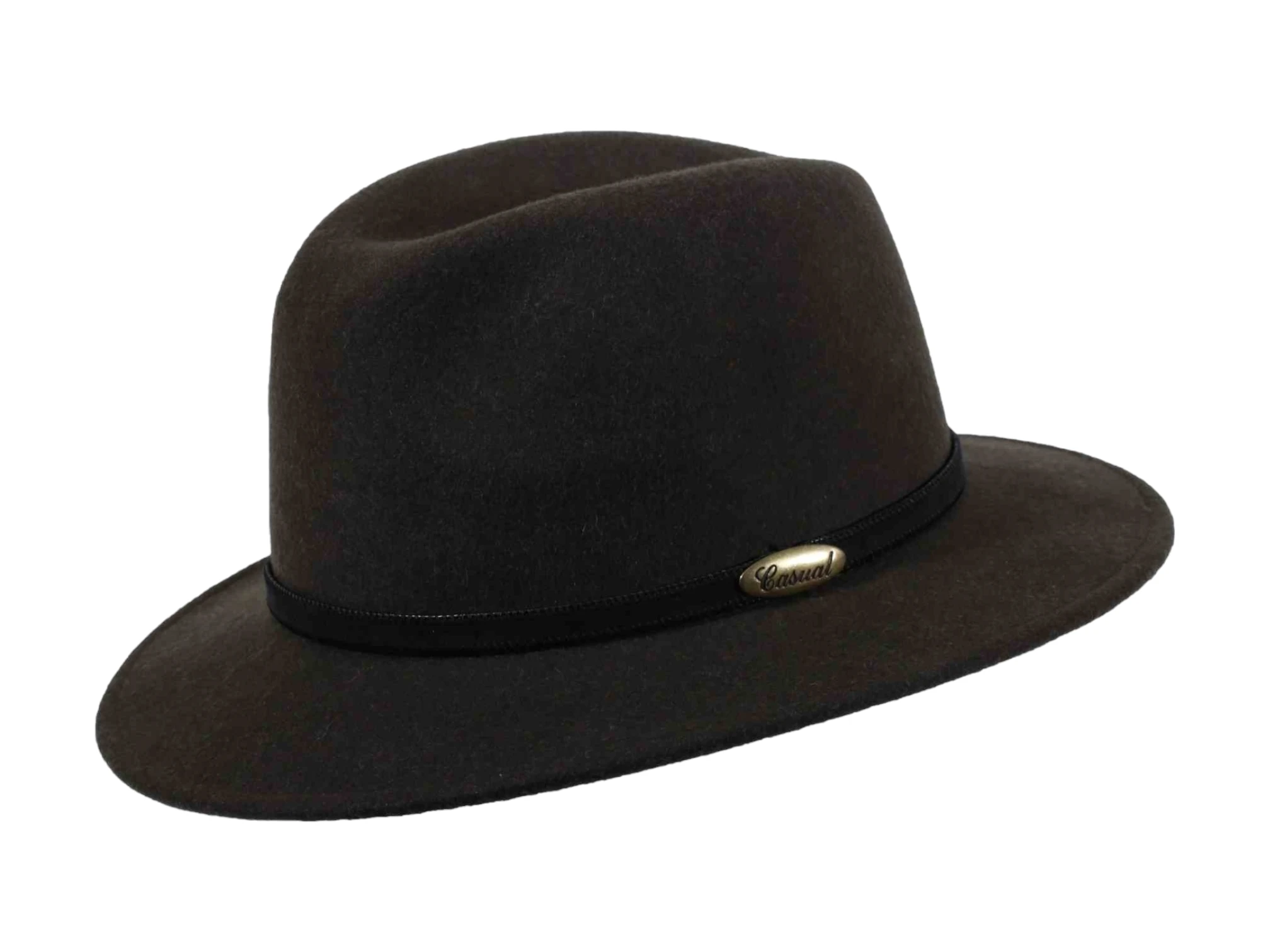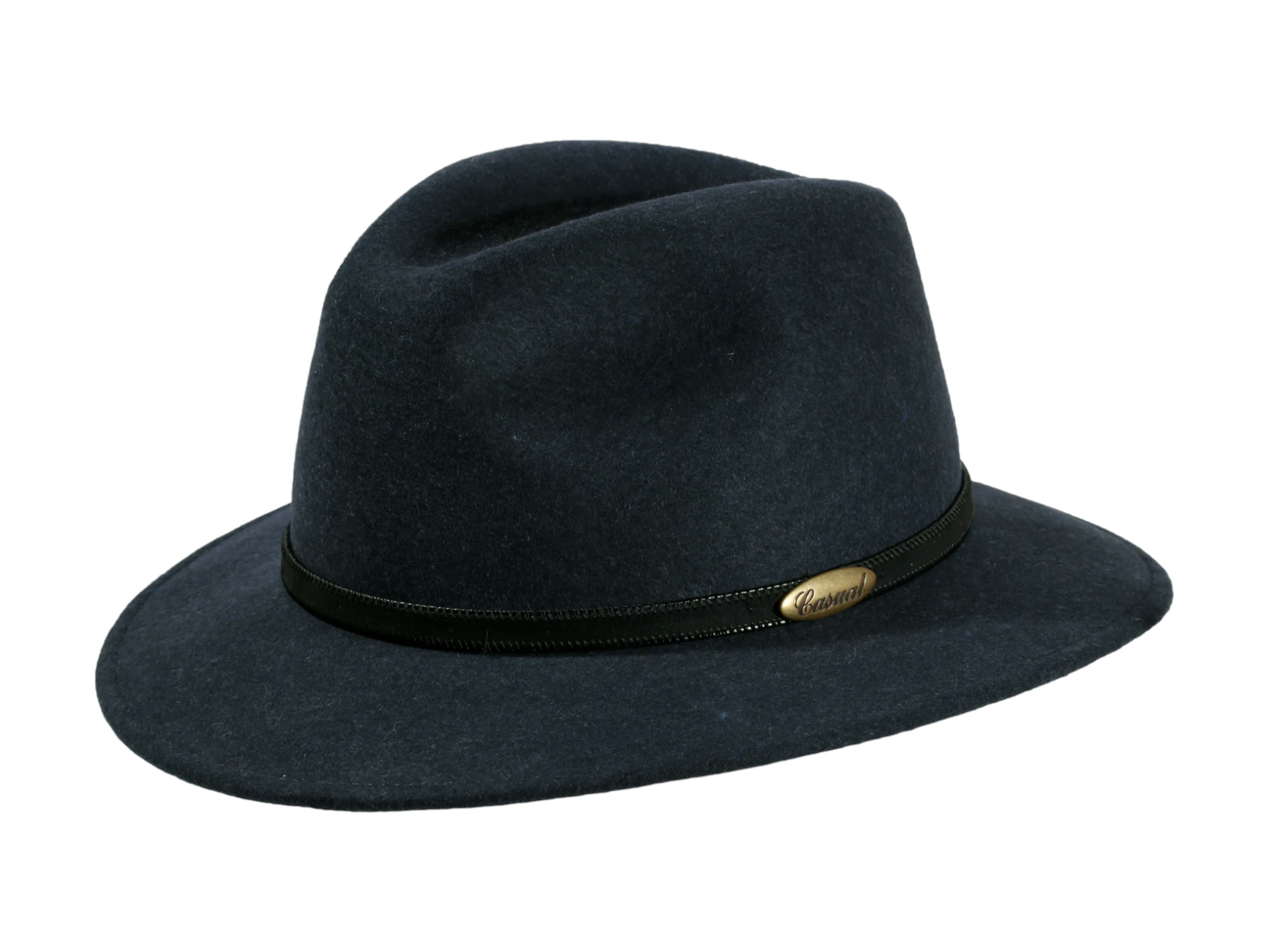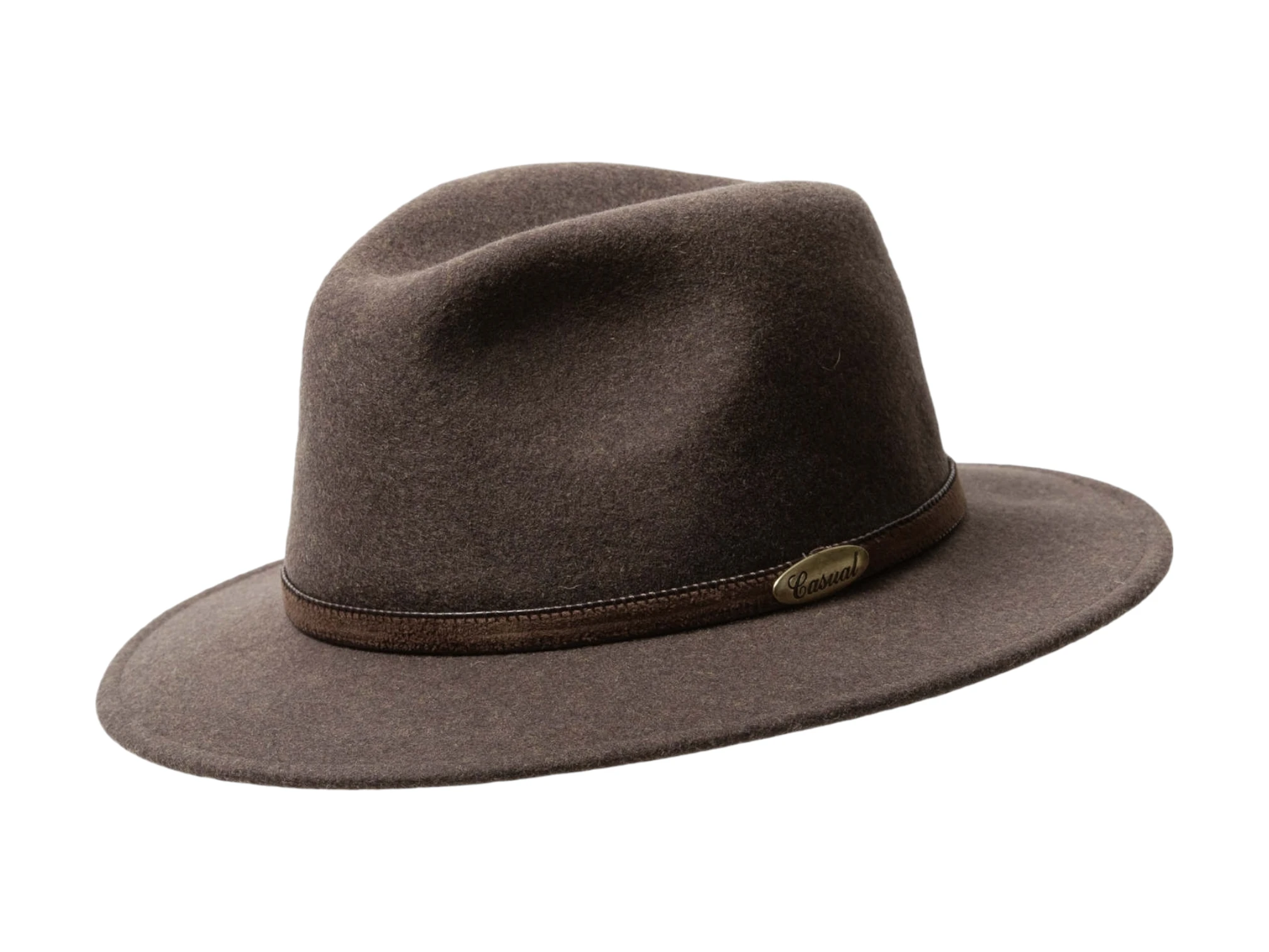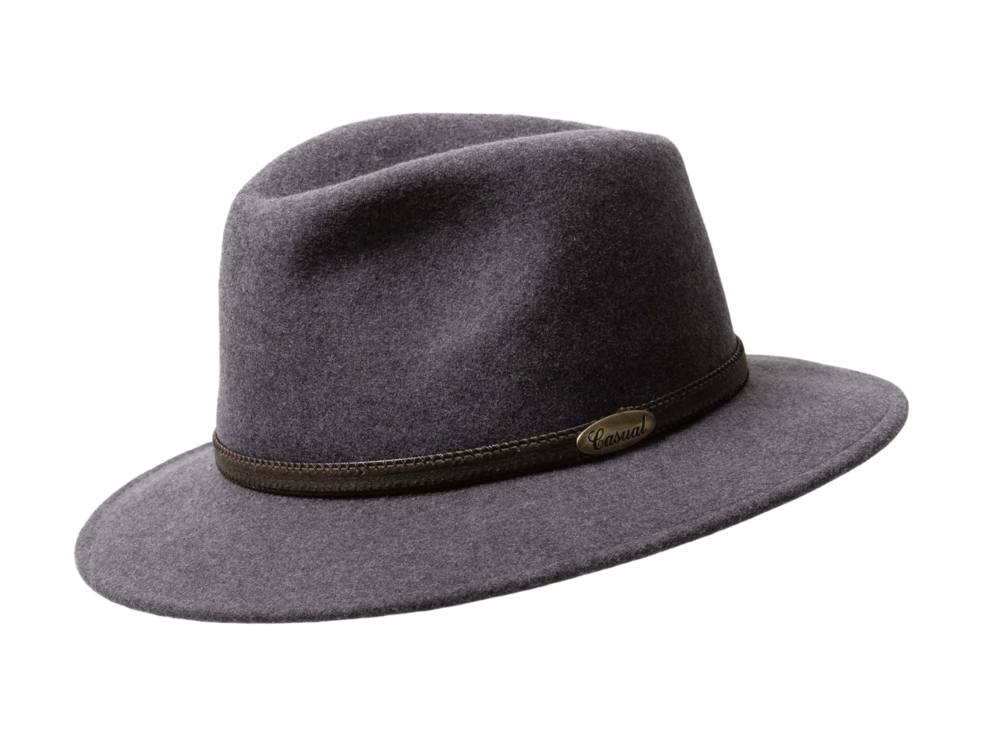 Gefertigt aus 100% meliertem Wollfilz, überzeugt dieser Hut durch seine edle Struktur, die sanfte Farbnuancen sichtbar macht und ihm eine elegante Lebendigkeit verleiht. Das schmale Lederhutband, seitlich akzentuiert mit dem ikonischen „Casual“-Messingschild, betont die stilvolle Linienführung.