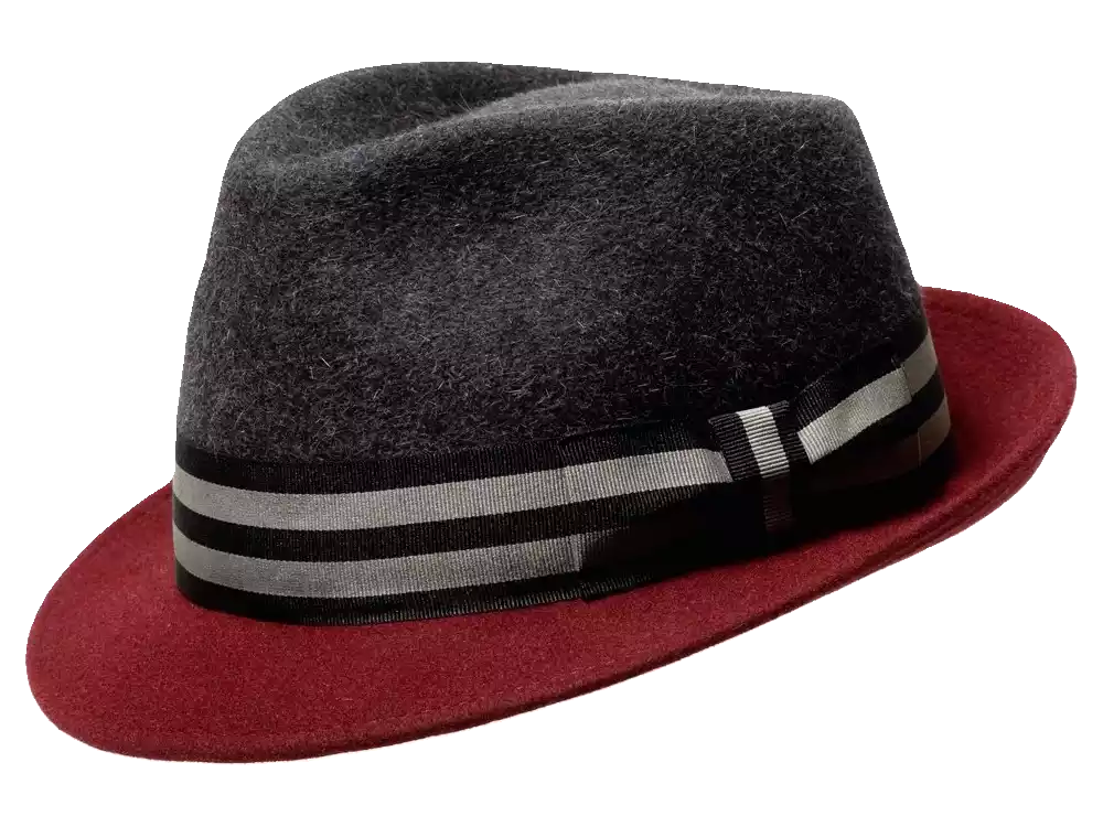 Der Trilby 2 Pieces spielt mit den Kontrasten: Jede Variante des Hutes kombiniert zwei harmonische Farbtöne – wie Bordeaux mit Grau oder Blau mit Bordeaux – und verleiht jedem Outfit das gewisse Etwas. Mit einer Randbreite von 5 cm und einer Kopfhöhe von 10,5 cm bietet dieser Hut den perfekten Mix aus klassischem Stil und modernem Design. Die Garnitur aus gestreiftem Rebsband mit einer stilvollen Masche rundet das elegante Erscheinungsbild ab.