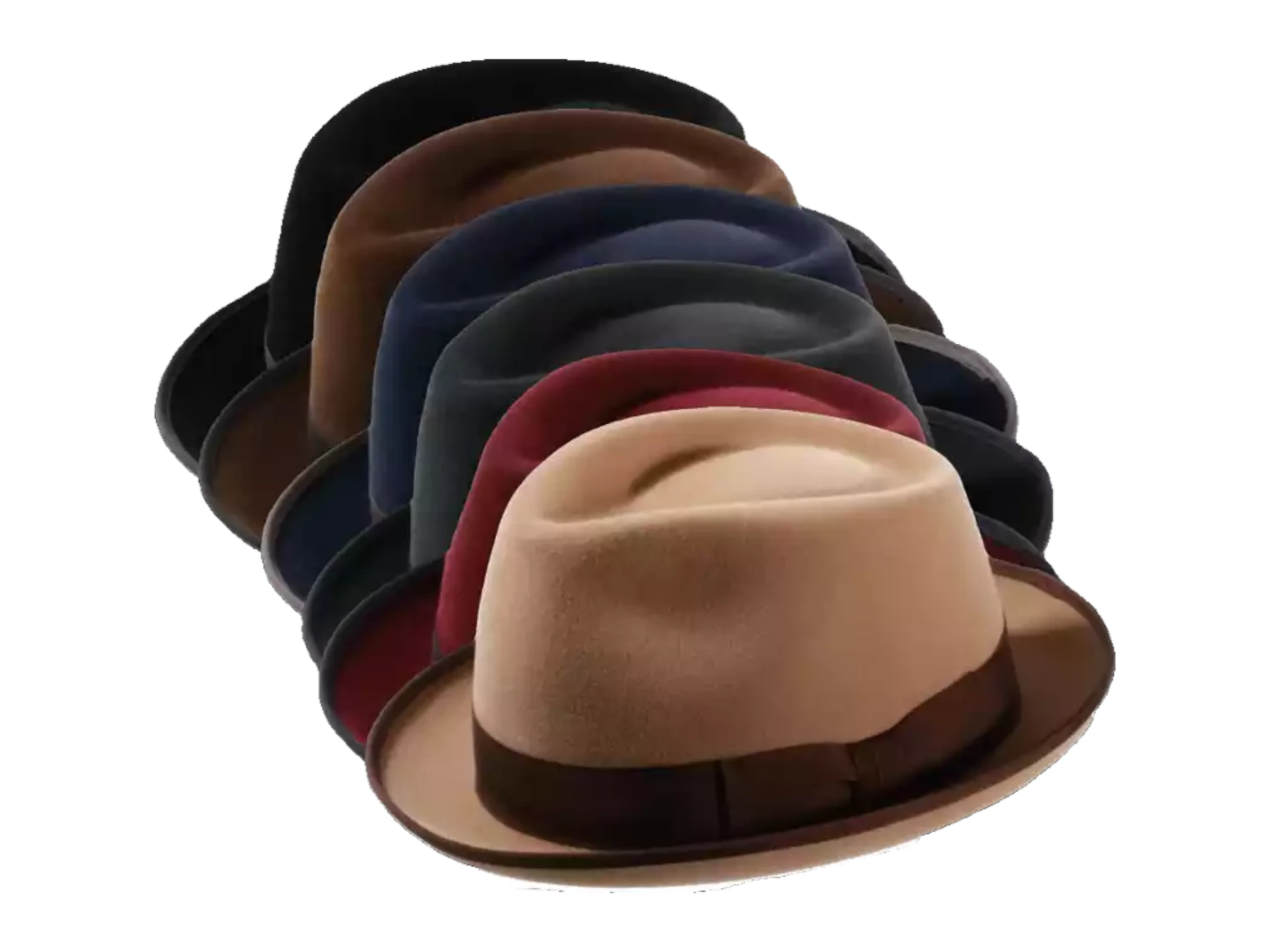 Der Hut ist in sieben Farbkombinationen erhältlich, darunter Schwarz mit Mittelgrau, Kakao mit Schwarz und Bordeaux mit Marineblau.