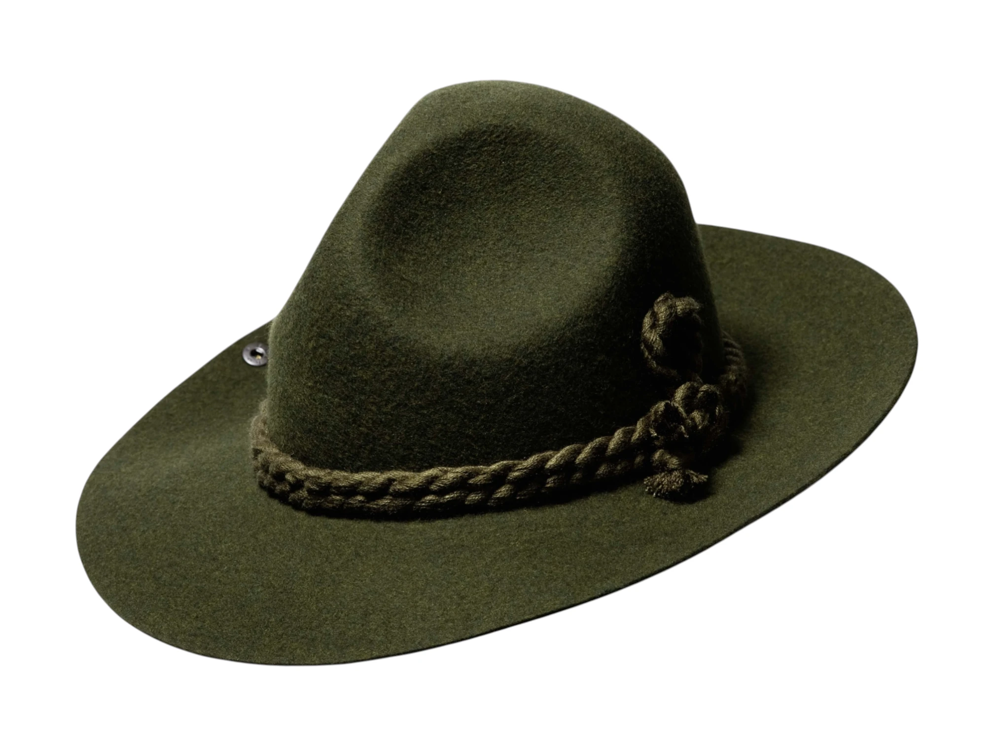 Gefertigt aus 100% robustem Wollfilz, überzeugt der Hut durch seine Randbreite von 8 cm und eine imposante Kopfhöhe von 13.5 cm. Seine besondere Funktionalität: Dank eines seitlichen Druckknopfs lässt sich die rechte Krempe an der Hutkrone fixieren – so stört der Rand nicht beim Anvisieren des Ziels und bietet dennoch Schutz vor Sonne und Regen.
