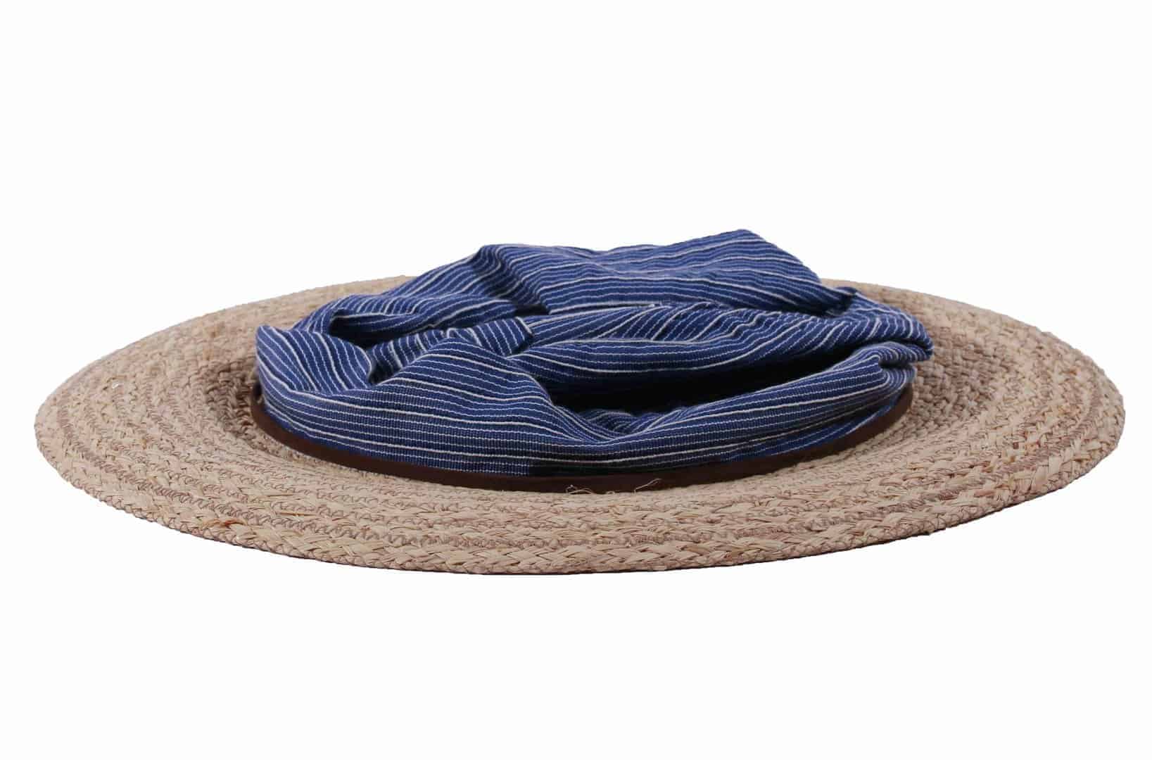 Der Hut verbindet eine breite, schattenspendende Raffia-Krempe mit einer weich fallenden Stoffkrone in gestreiftem Navyblau. Der Clou: Er lässt sich flach zusammenfalten, ohne seine Form zu verlieren. Die feine Garnitur aus Lederoptik-Schnur und edlem Knopf verleiht ihm einen zeitlosen Akzent.