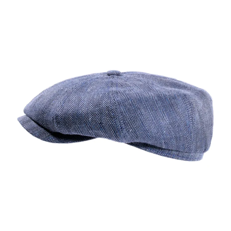 Die Newsboy-Cap überzeugt mit ihrem klassischen Fischgratgewebe, das eine elegante Struktur und ein angenehm leichtes Tragegefühl verleiht. Die harmonische Farbgebung in Jeansblau und Steingrau unterstreicht ihre Vielseitigkeit – perfekt für lässige Sommerlooks oder elegante Kombinationen.
