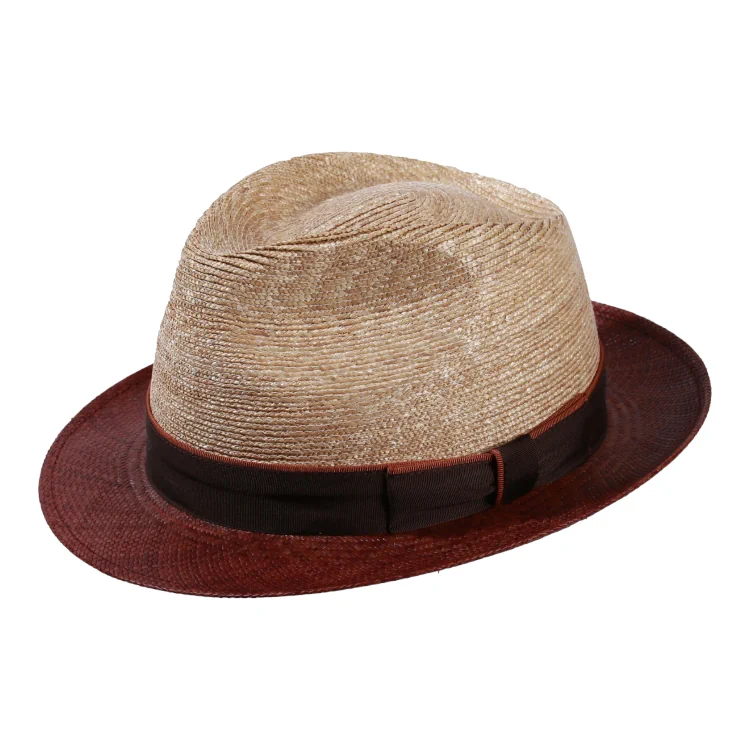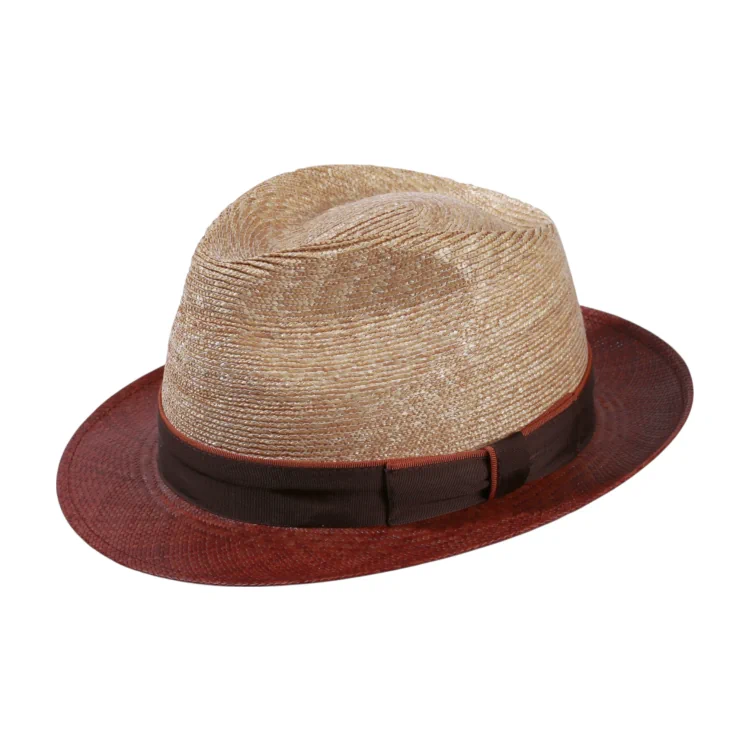 Die Kombination aus 50% fein geflochtenem Stroh und 50% hochwertigem Panama verleiht dem Hut eine luxuriöse Textur und optimale Atmungsaktivität. Der naturfarbene Hutkopf wirkt leicht und klassisch, während der braune Rand einen stilvollen Kontrast bildet und gleichzeitig für soliden Sonnenschutz sorgt. Das dunkelbraune Rebsband mit feinem Kakaofarbenem Passepoil verleiht dem Modell eine elegante Rahmung dezent, aber hochwertig.
