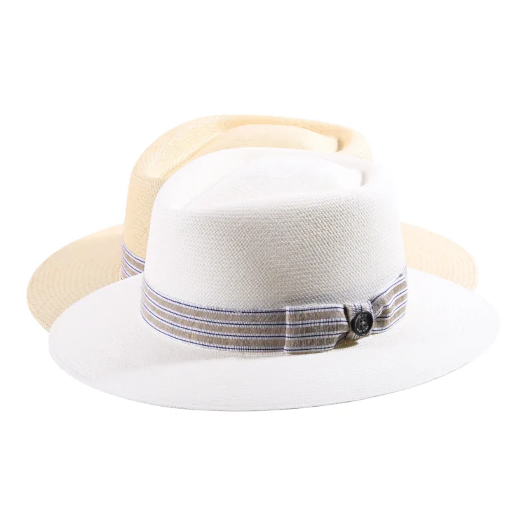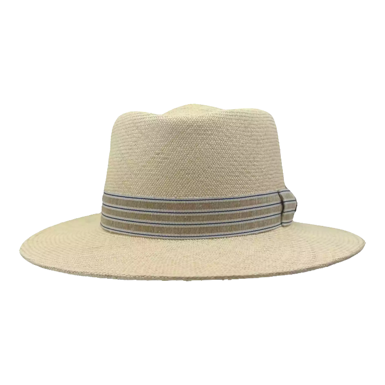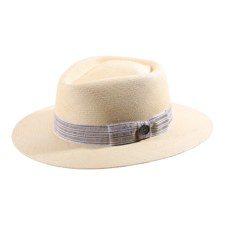 Die feine Cuenca-Webart dieses Panamahutes sorgt für eine gleichmäßige, edle Oberfläche. Die präzise verarbeitete Krempe bietet nicht nur Schatten, sondern verleiht dem Hut eine klassische, maskuline Eleganz. Der gestreifte Kontrast der Garnitur hebt das Design geschmackvoll hervor und unterstreicht die liebevolle Detailverliebtheit.