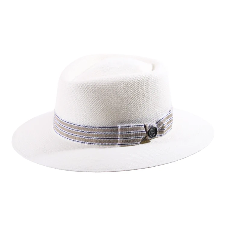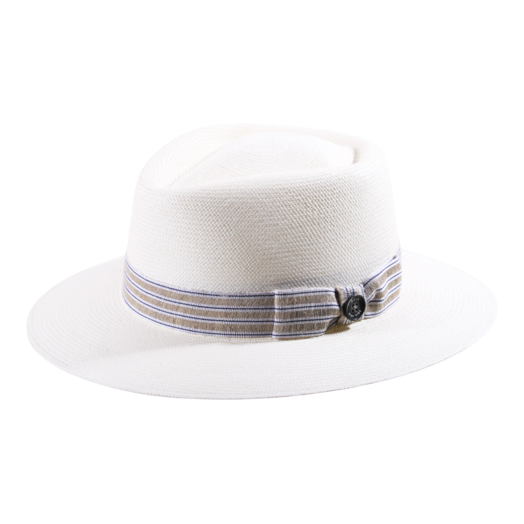 Der Hut wird aus feinstem Panama-Stroh der Qualitätsstufe 16 gefertigt ein Ausdruck höchster Handwerkskunst. Mit einer harmonischen Krone von 9 cm und einem großzügigen Rand von 7 cm bietet er optimalen Schutz vor der Sonne und bleibt dabei angenehm leicht und atmungsaktiv. Das markant gestreifte Hutband in natürlichen Tönen und der ikonische Risa-Qualitätsknopf unterstreichen seine exklusive Herkunft und seine modische Raffinesse.