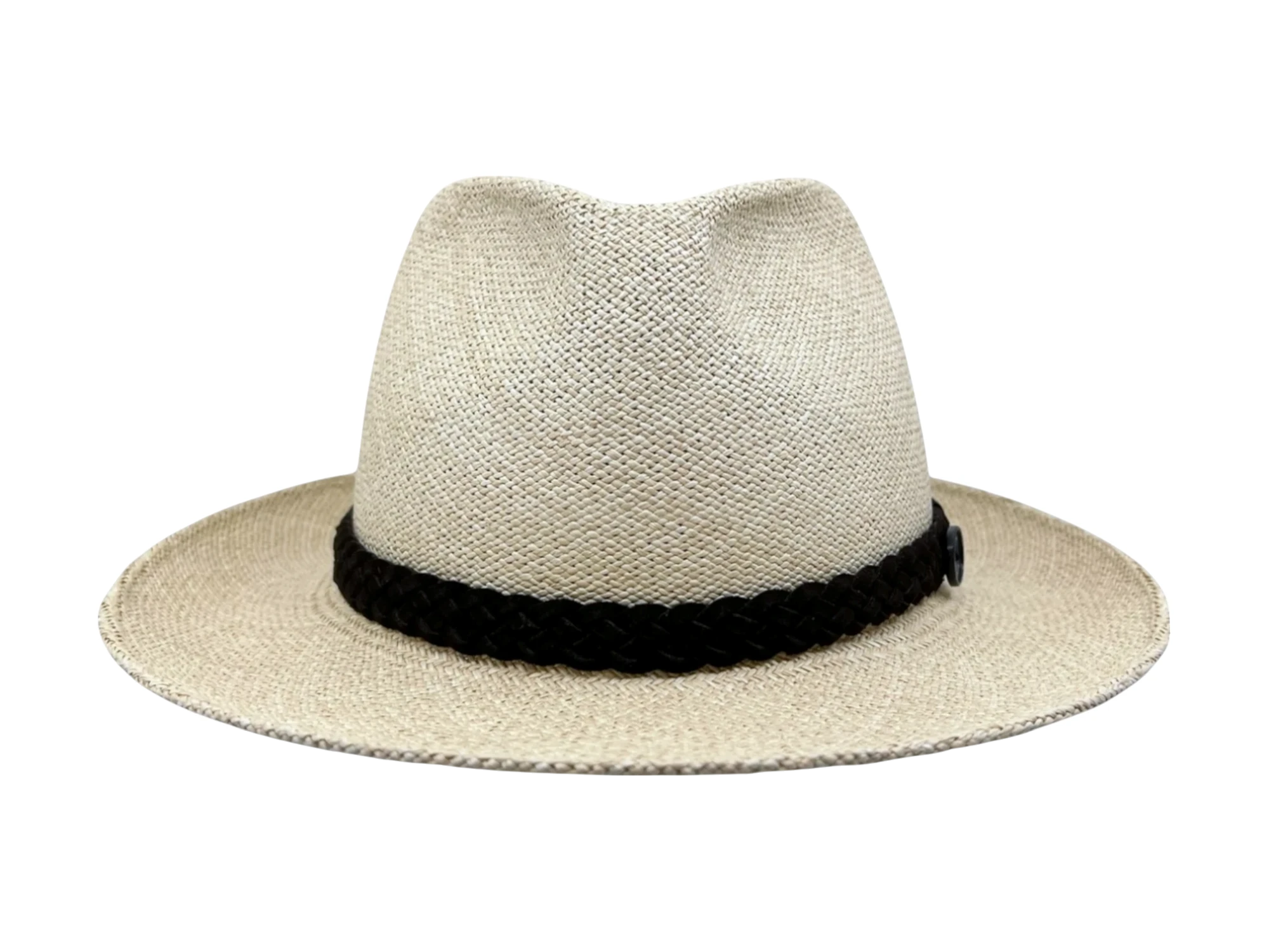 Die Verarbeitung überzeugt durch meisterhafte Handarbeit und feines Flechtwerk mit leicht unregelmäßiger Struktur charakteristisch für Twisted Panama. Das edle Lederband in Dunkelbraun setzt einen dezenten Kontrast zum Naturton des Strohs. Ein Design, das Understatement und Stilbewusstsein perfekt vereint.