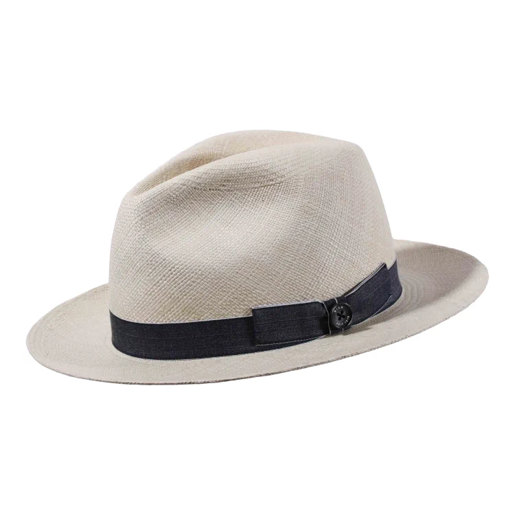 Geflochten aus 100?% originalem Panama-Stroh im hochwertigen Brisa-Flechtgrad #6, begeistert dieses Modell durch seine Leichtigkeit und natürliche Ausstrahlung. Mit einer Krempenbreite von 7?cm und einer Kopfhöhe von 11?cm schützt der Hut zuverlässig vor Sonne, während er luftig und komfortabel sitzt auch bei hohen Temperaturen. Die Garnitur aus edlem Rebsband in Jeansblau unterstreicht die Individualität dieses Modells und wird von einem charaktervollen Knopf mit Risa-Prägung veredelt.