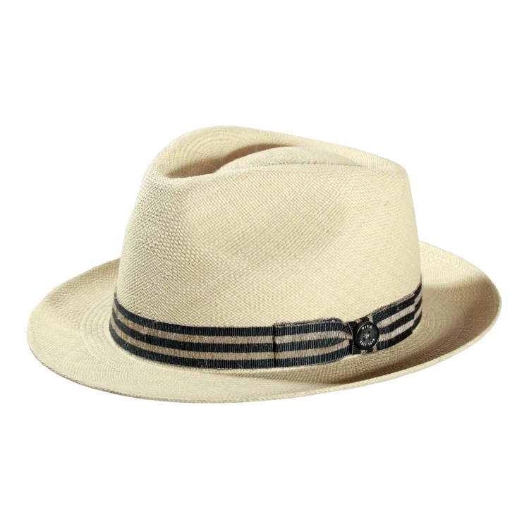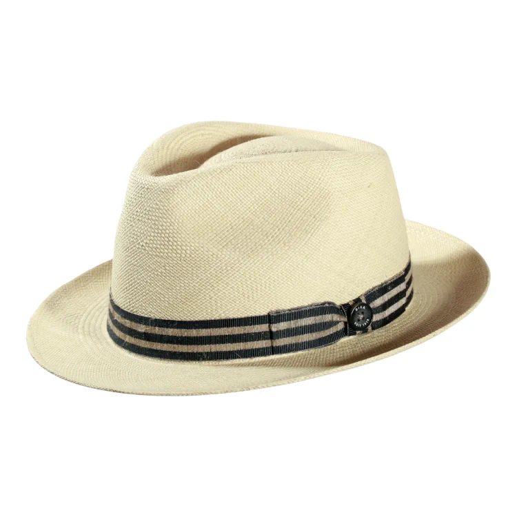 Die charakteristische Player-Silhouette vereint Lässigkeit mit Raffinesse. Das fein gewebte Stroh wird sorgfältig in Form gebracht und mit einer hochwertig gestreiften Leinen-Garnitur akzentuiert ein Ausdruck handwerklicher Exzellenz. Die Kombination aus sommerlich hellem Naturton und Streifendetail verleiht dem Hut eine unverwechselbare Ausstrahlung.