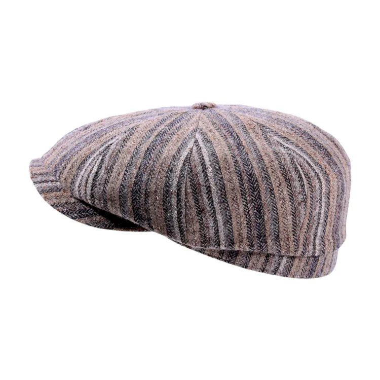 Die Paperboy-Mütze Shelby vereint zeitlosen Charme mit luxuriösen Materialien. Ihr großzügiger Ballonschnitt und die klassische Knopfkrone werden hier mit einem außergewöhnlichen Streifenmuster in Beige-, Grau- und Naturtönen kombiniert. Das macht sie zu einem markanten Accessoire, das sich stilvoll von schlichten Outfits abhebt.