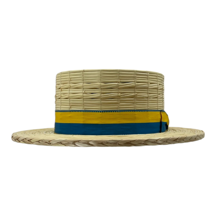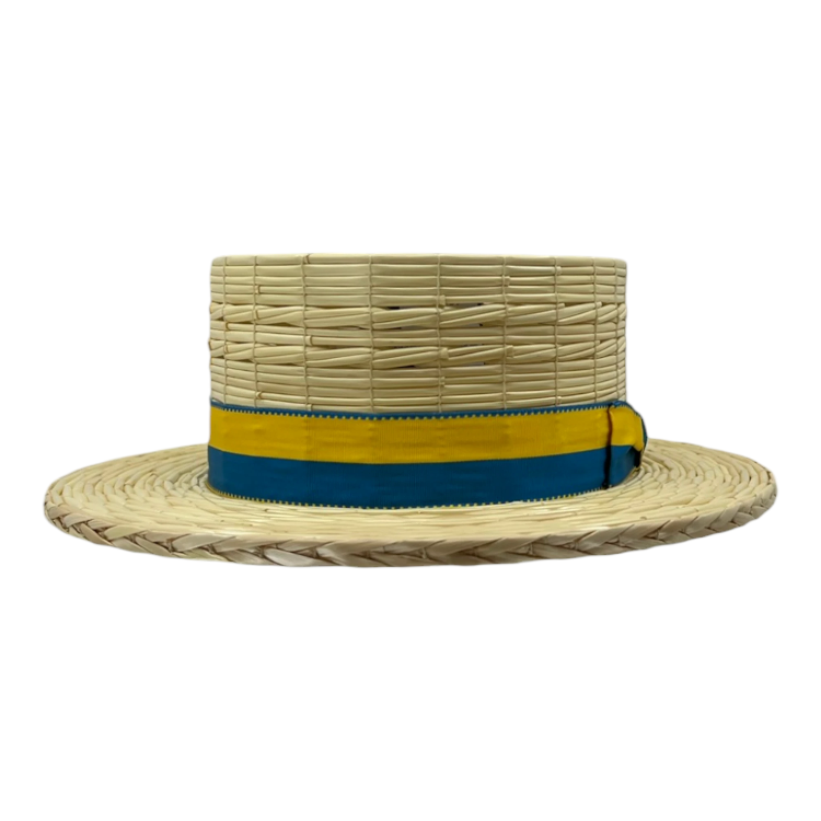Der Hut ist in verschiedenen Naturfarben erhältlich, darunter Gelb/Blau, Rot/Weiss/Schwarz, Blau/Weiss/Schwarz, Beige/Braun/Schwarz und Schwarz uni.