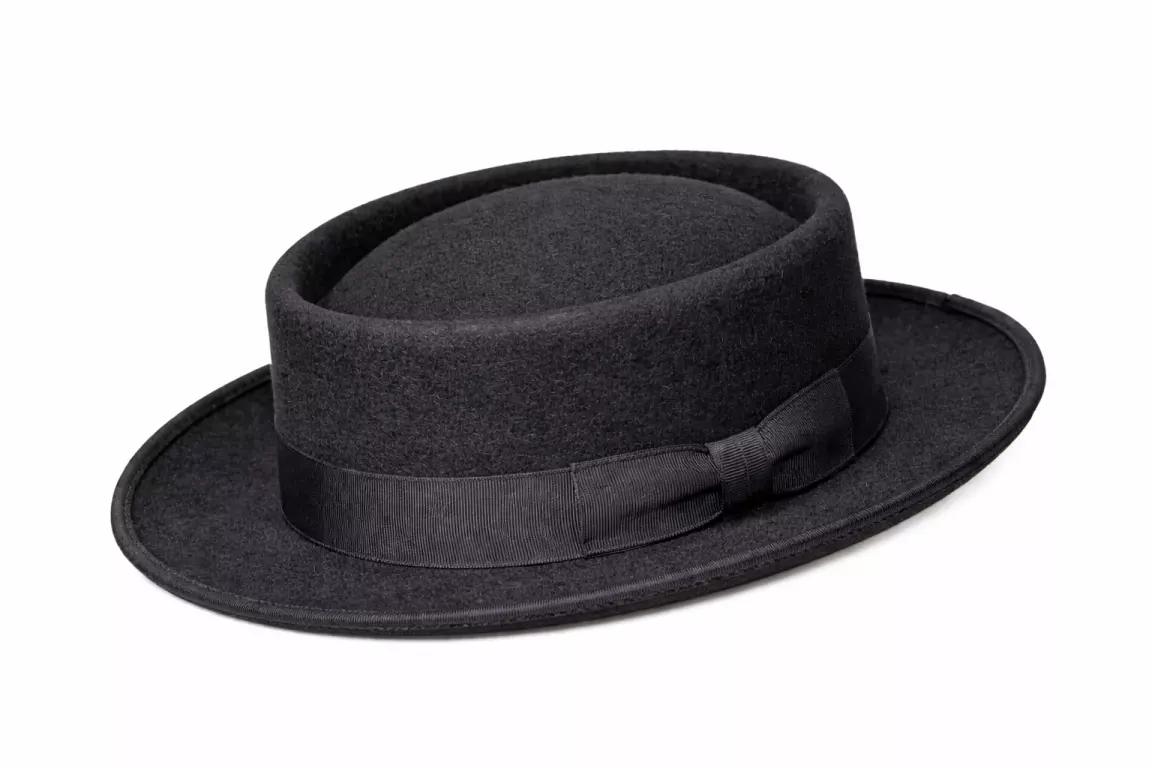 Die flache Form, das eingefasste Rebsband und die sorgfältige Verarbeitung machen diesen Hut zu einem unverwechselbaren und stilvollen Accessoire, das Tradition und Moderne vereint.