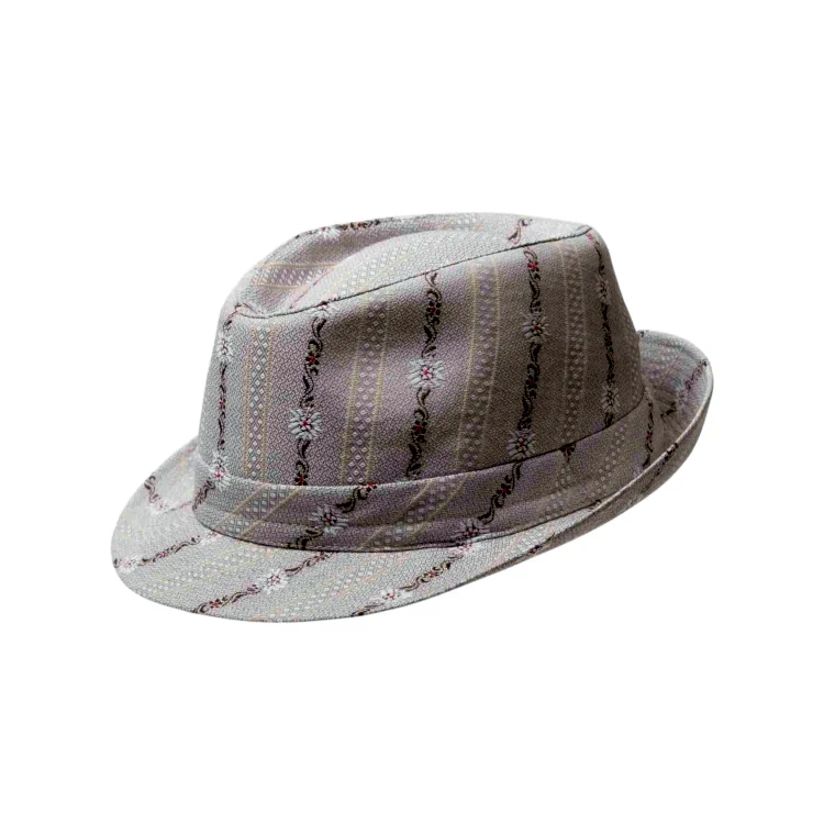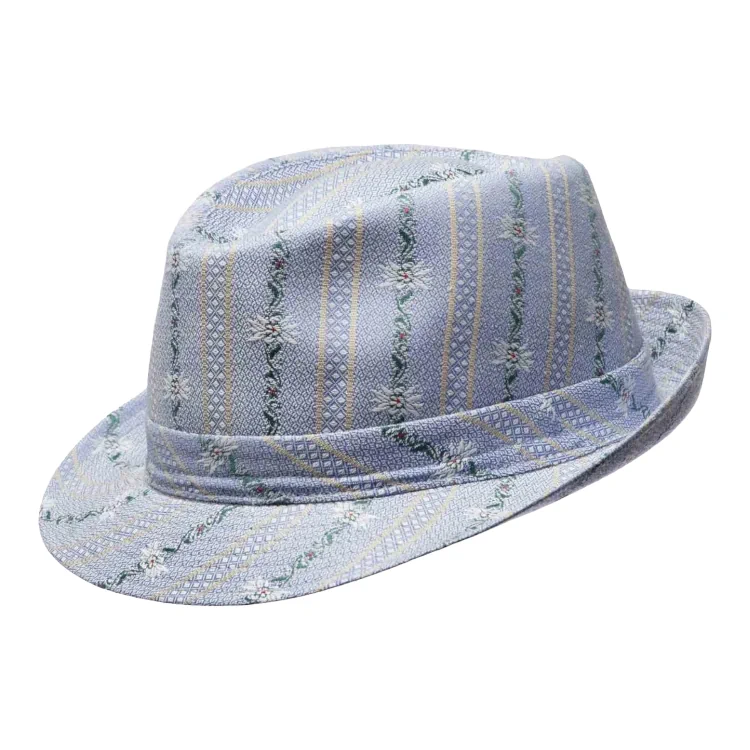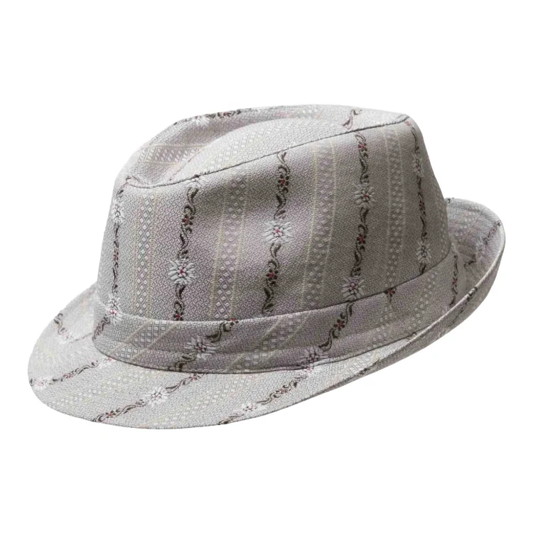 Dieser Trilby besticht durch seine elegante Form mit leicht nach oben geschwungener Krempe und markanter Kopfhöhe. Die Stoffgarnitur im Edelweissmotiv rundet das Design stilvoll ab. Ein perfektes Accessoire, um sowohl legeren als auch edlen Sommerlooks den letzten Schliff zu verleihen.