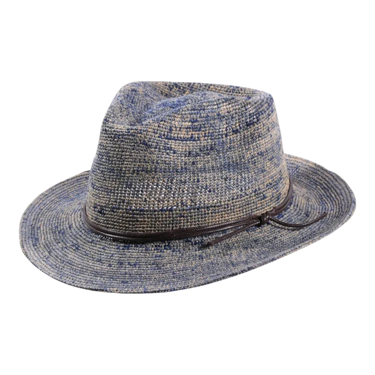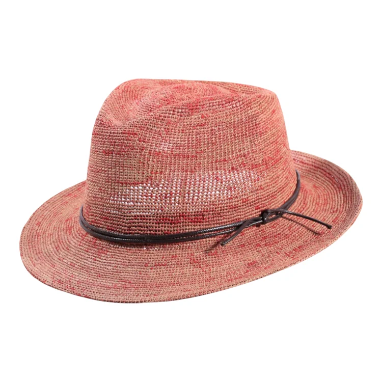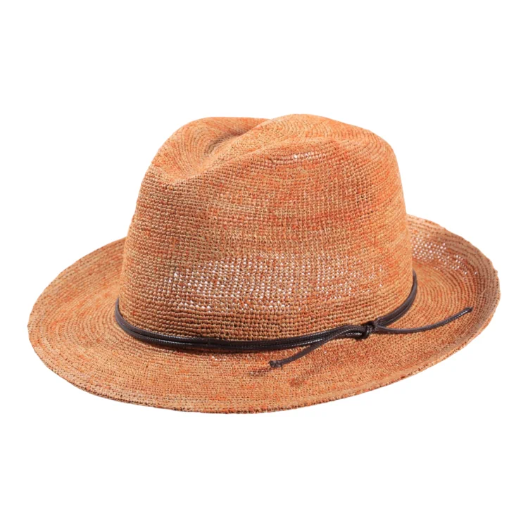 Dieser sommerliche Fedora-Hut besticht durch seine lässige Eleganz und das aufwendig gearbeitete Raffia-Häkelmuster. Die klassische Form mit einer mittleren Krempenbreite und der stilvollen Krone wird durch das edle Hutband aus brauner Lederschnur besonders hervorgehoben. Ein echter Hingucker, der nachhaltigen Lifestyle und modische Individualität gekonnt vereint.