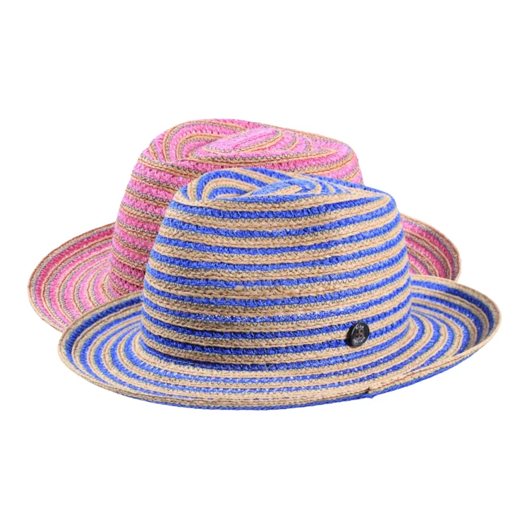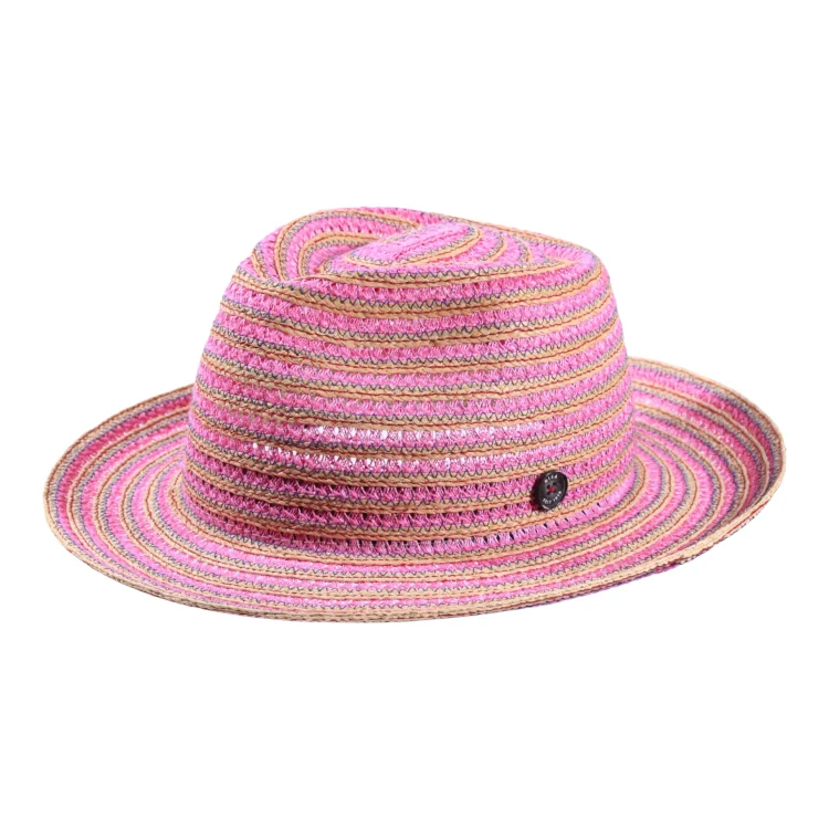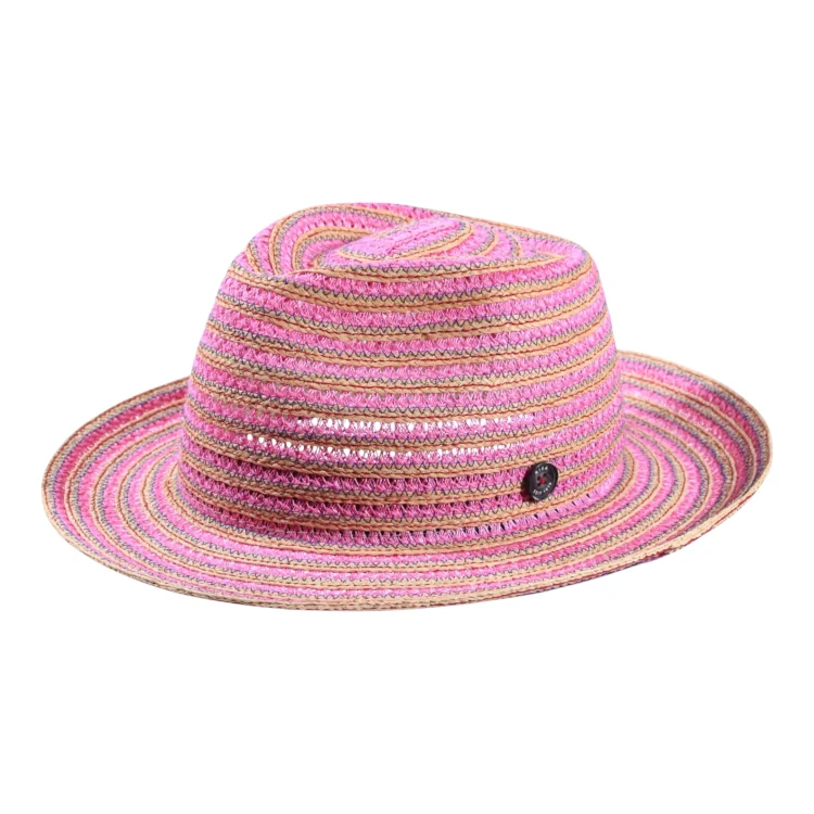 Dieser Fedora ist ein ausdrucksstarker Hingucker mit modischem Streifenverlauf und leichter Transparenz. Der strukturierte Aufbau aus Hanf- und Raffiastreifen erzeugt eine lebendige, fast textile Oberfläche, die sich angenehm anfühlt und gleichzeitig formstabil bleibt. Das fein eingearbeitete Muster spricht für Liebe zum Detail und Handwerkskunst auf höchstem Niveau.