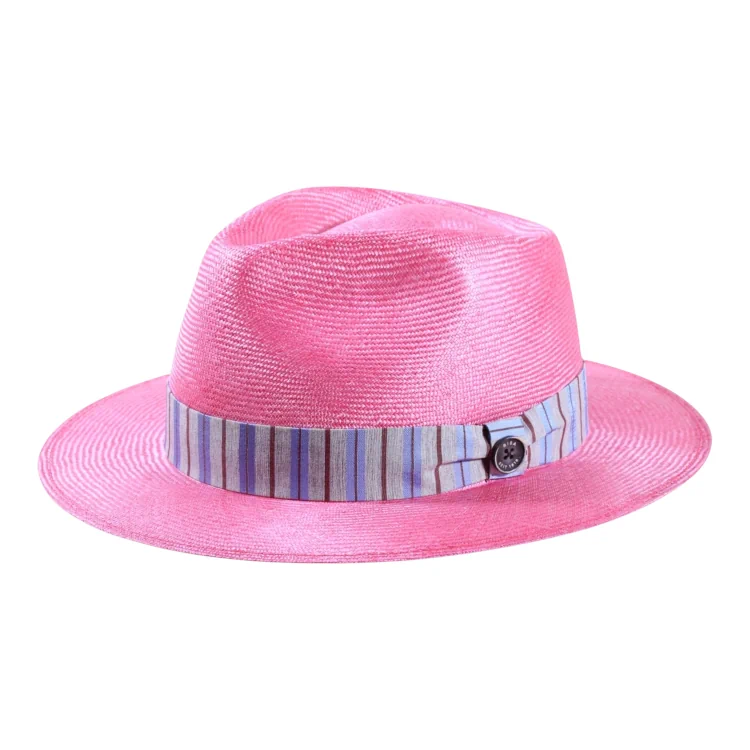 Der federleichte Fedora besticht durch seinen makellosen Aufbau: Die eng geflochtene Parasisolstruktur bringt einen seidigen Glanz hervor, der im Sonnenlicht schimmert. Die strukturierte Garnitur aus feiner Seide sorgt für einen raffinierten Farbkontrast. Mit Liebe zum Detail handverarbeitet ein Paradebeispiel für hohe europäische Hutmacherkunst.