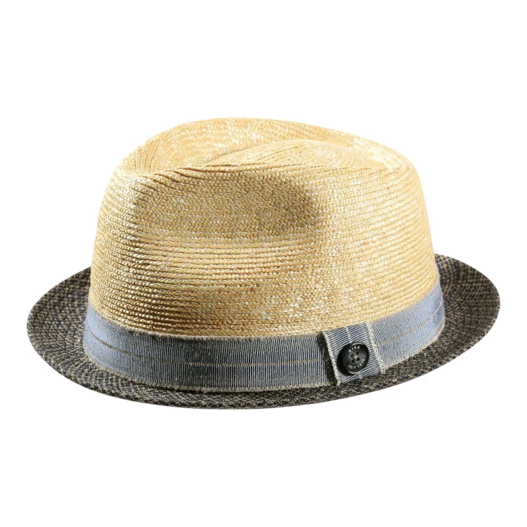 Die klassische Player-Krone trifft auf eine fein gearbeitete Krempe mit harmonischem Kontrast die Kombination aus grob geflochtenem Stroh und glatter Seide unterstreicht die hochwertige Verarbeitung. Ein Leinenhutband in zartem Hellblau mit ikonischem Risa-Knopf auf schräger Traverse rundet das Design stilvoll ab.